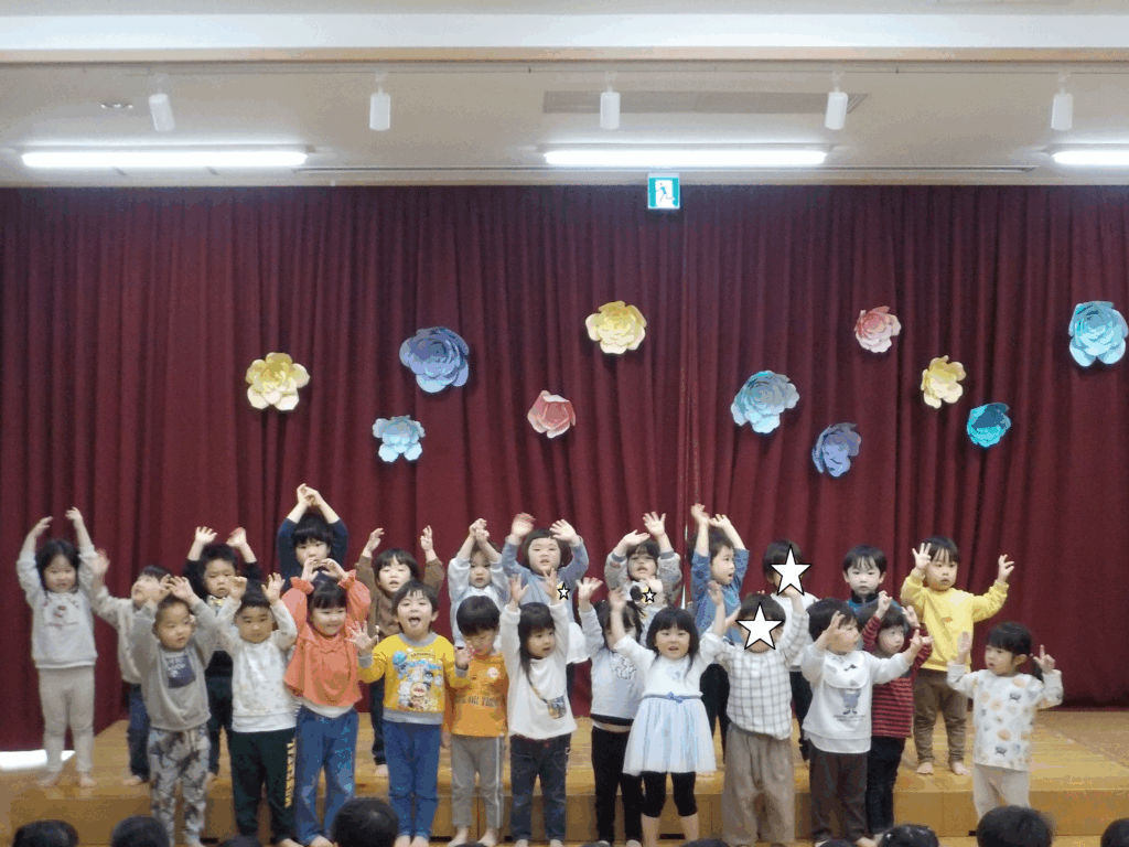 ほし組は園歌を歌ってくれました。たくさん練習して2番までスラスラ歌えるようになりました!大きな声で堂々と歌う姿はとても立派でした🎵