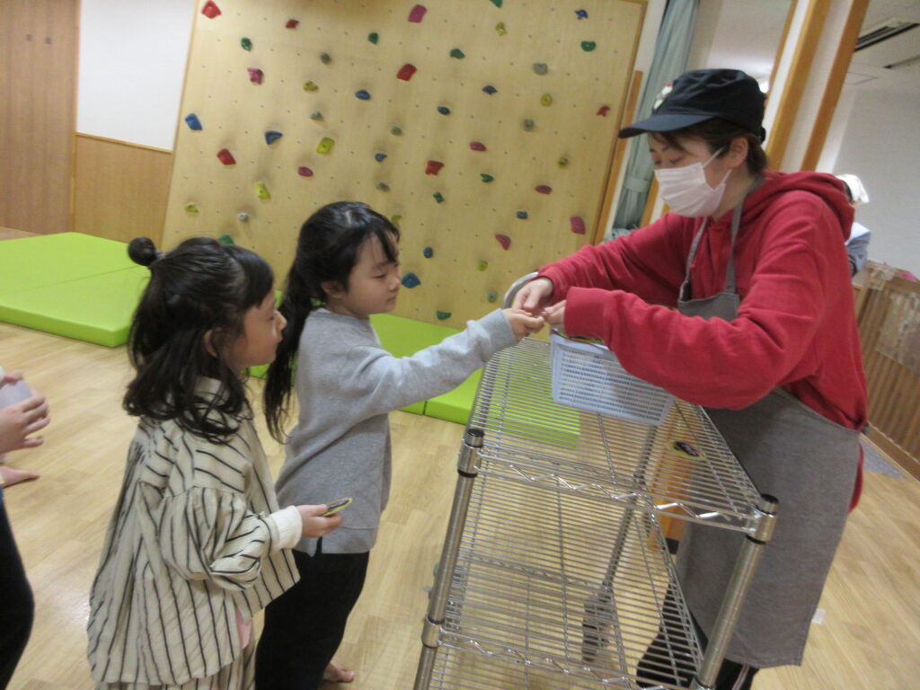給食の先生がお店屋さんになり、おやつを渡してくれました。