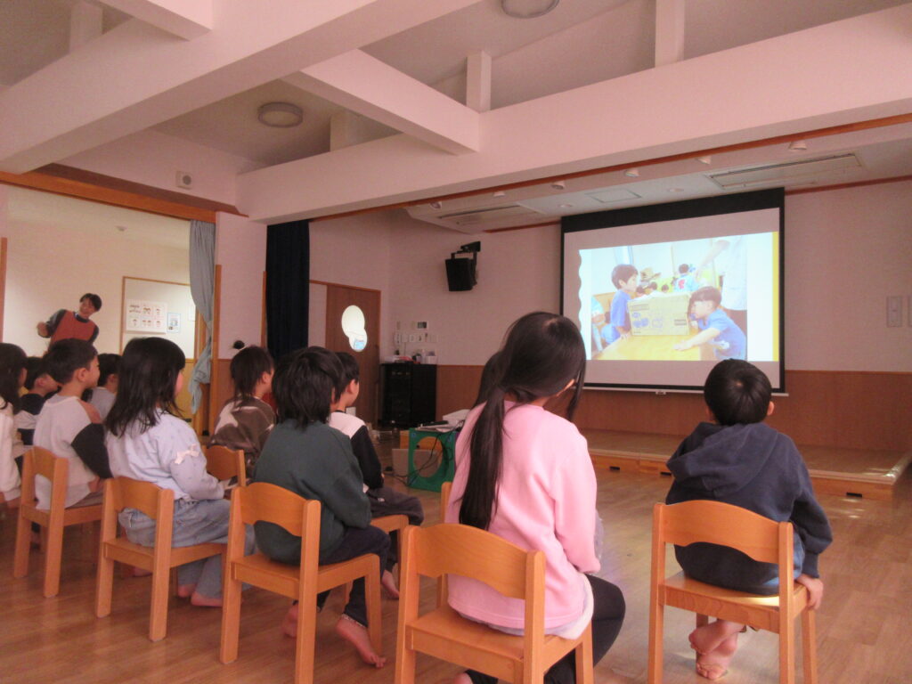 スライドショーでたいようぐみで過ごした1年間の写真を見て「なつかしい~」「こんなこともしたよね!」と、お友だちや保育士と振り返っていました😊