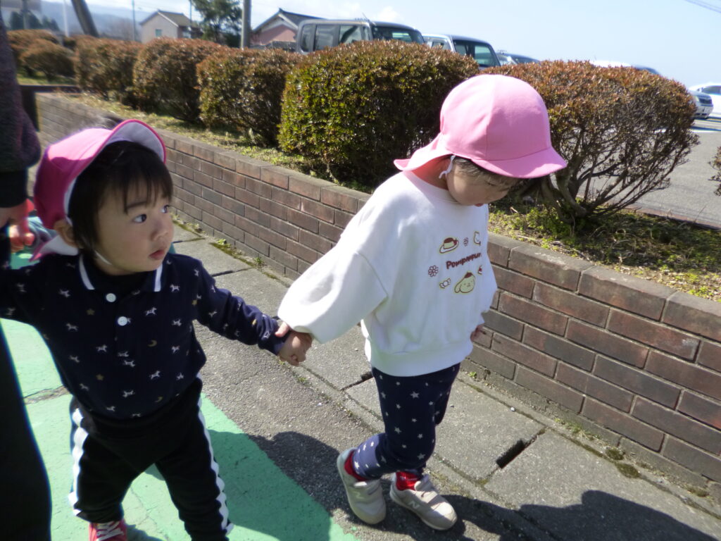 自分の足でしっかり歩けるようになったお友だちもいて、歩くことの楽しさも感じることができました。また、お散歩に出かけようね!