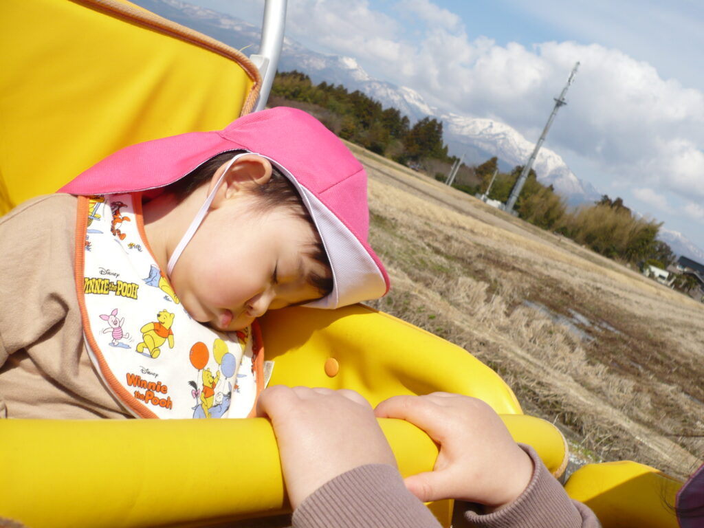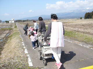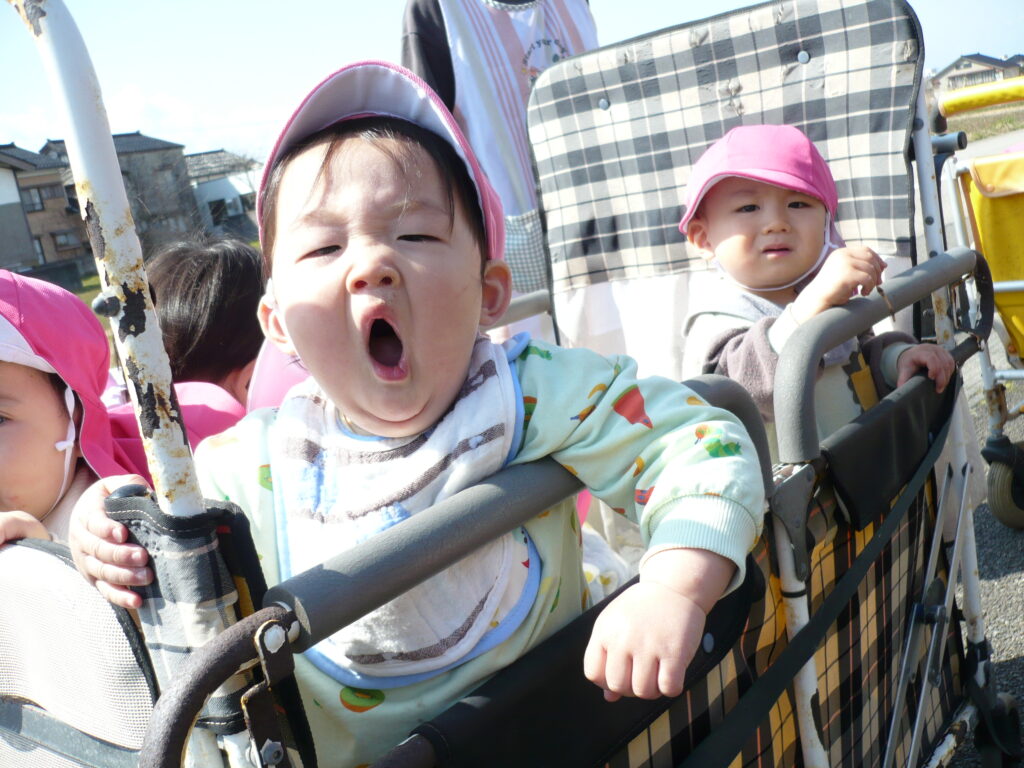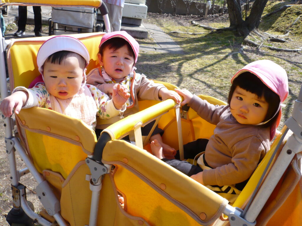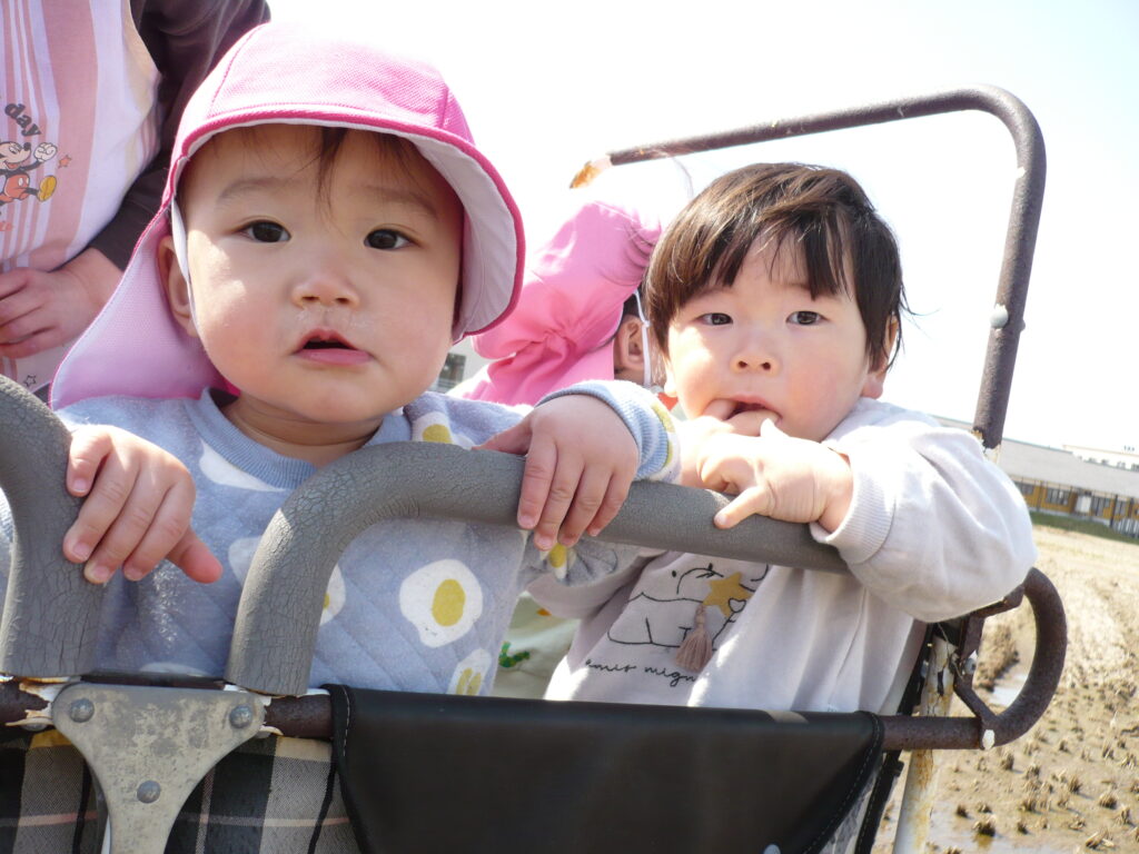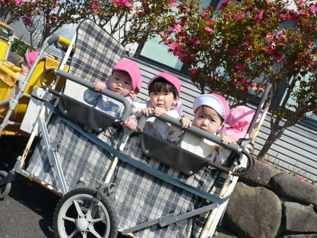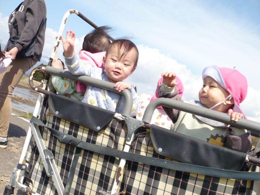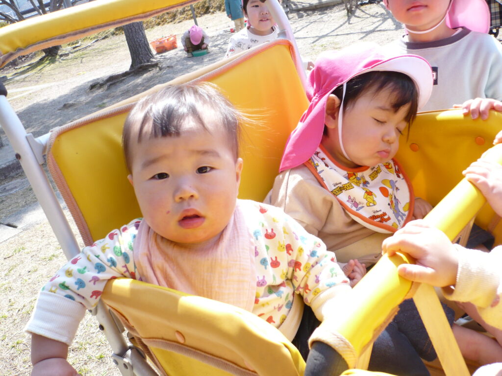 満開の椿や色とりどりの野花、つくしに大喜びで、手を伸ばして摘んでいました。月齢の小さなお友だちも、カートの中でつくしや花を持って振ったりしてご機嫌です。ぽかぽか陽気と揺れる心地よさに、寝てしまう可愛らしい姿も見られました。