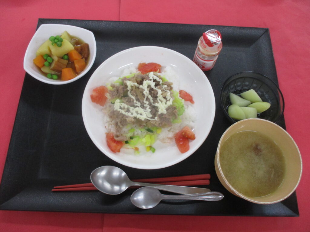温かいご飯の上に、キャベツ、きゅうり、コーン等の野菜と甘辛く炒めた肉を乗せ、その上にマヨネーズをかけました🍚🥄