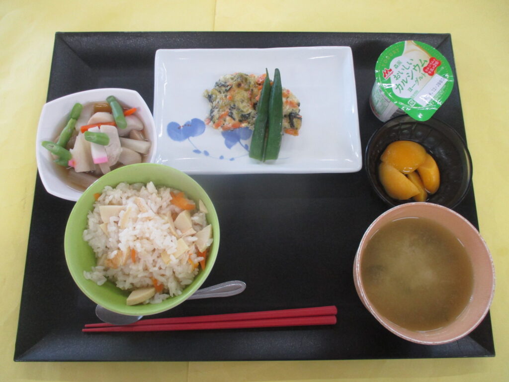 たけのこご飯 味噌汁 タラの若菜焼き のっぺい 果物🍐🍐🍐
