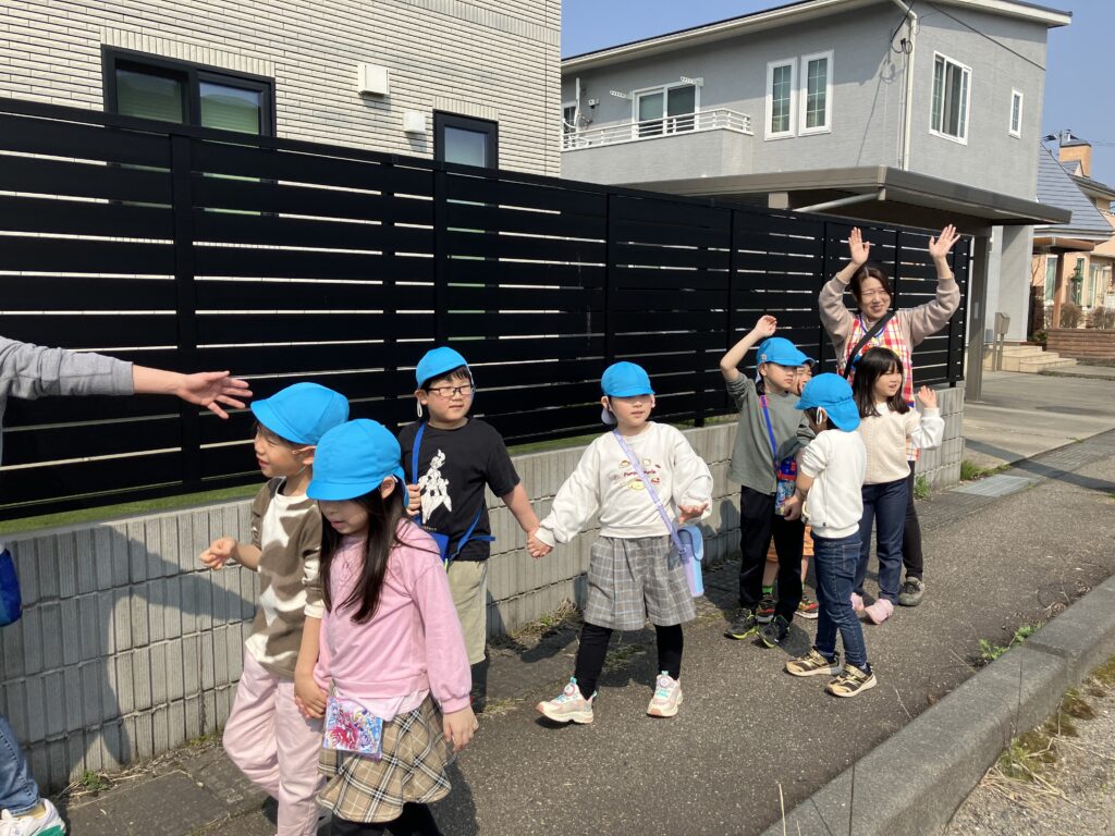 園庭からお見送りをしてくれる小さいお友だちに「いってきまーす!!」と手を振り出発!