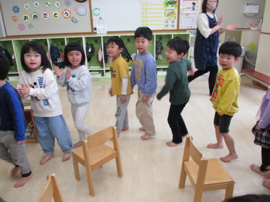 ホールでは昨年度異年齢のお友達と楽しんだ『ロケットに乗ってゴー!』