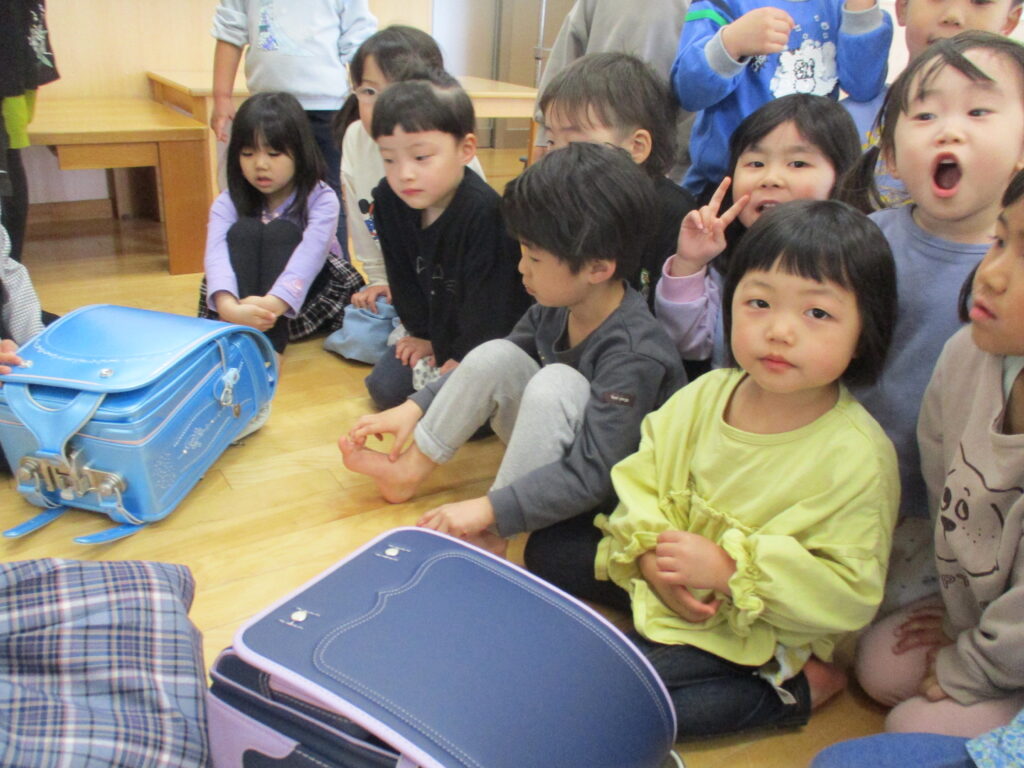 今日入学式の新1年生のお姉さんたちがランドセル姿を見せに来てくれました!教科書の中身を説明してくれて交流を楽しんでいました。