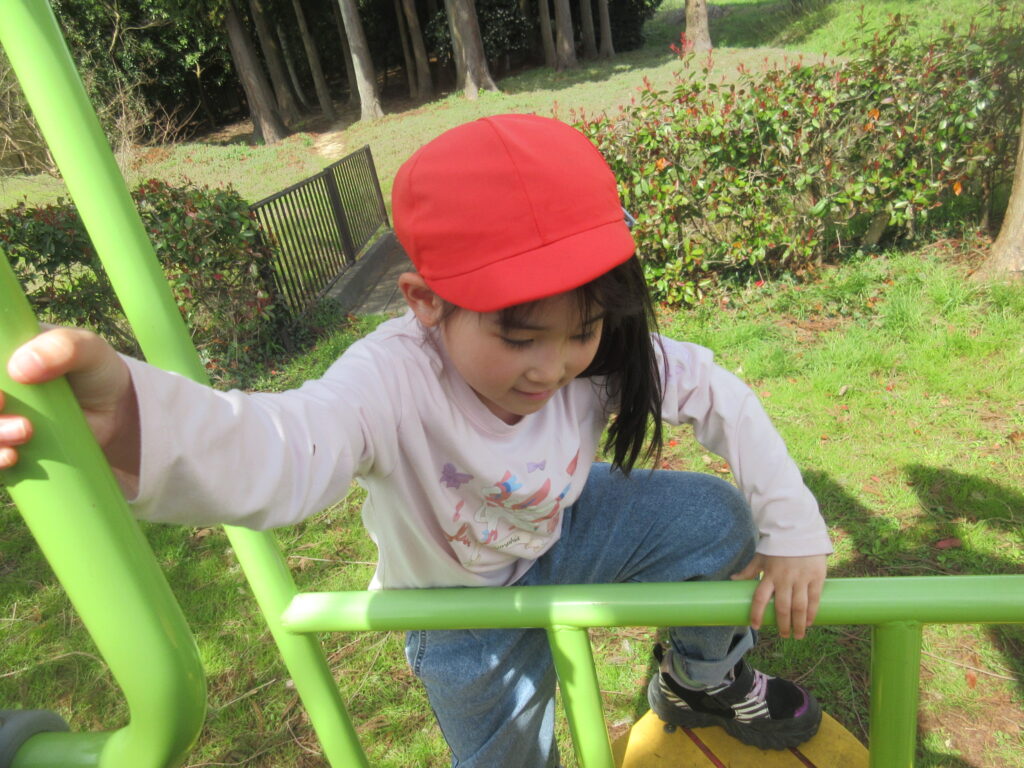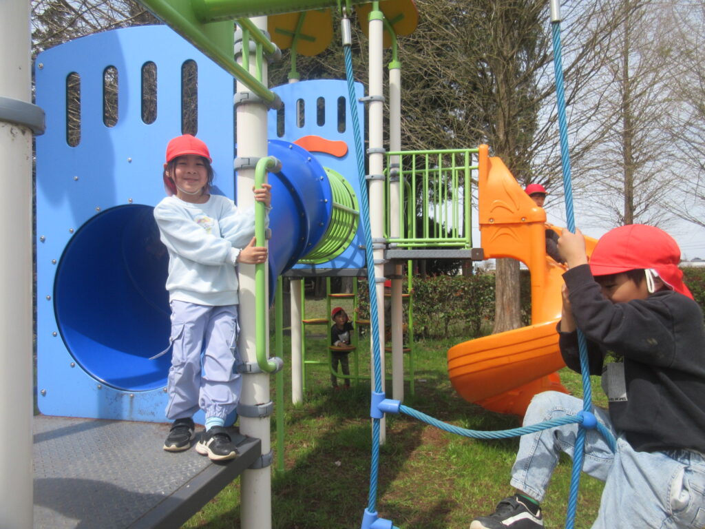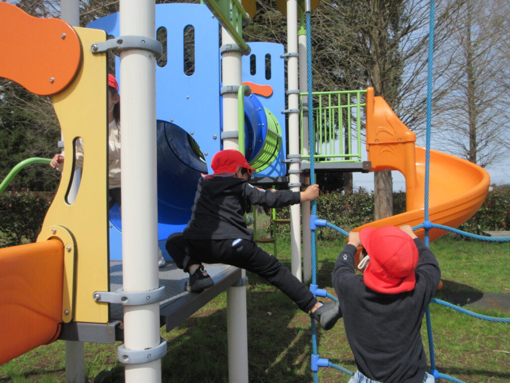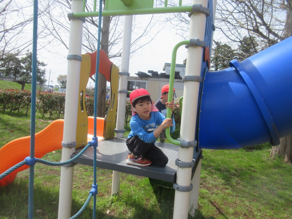 バランスをとることが上手なたいよう組さん、上手に登り、横に移動をしてすべり台に到達!!