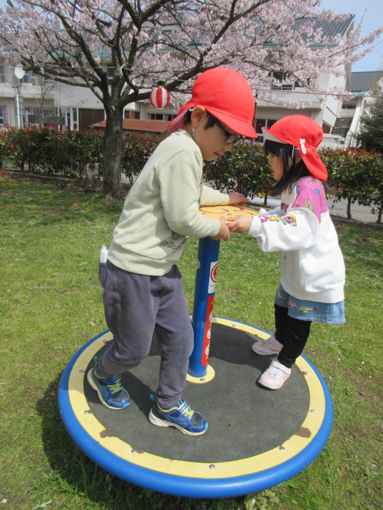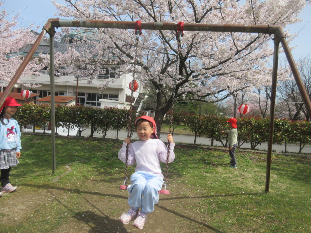 綺麗に咲いた桜をバックに順番に譲りあって使う姿はさすがの年長さん