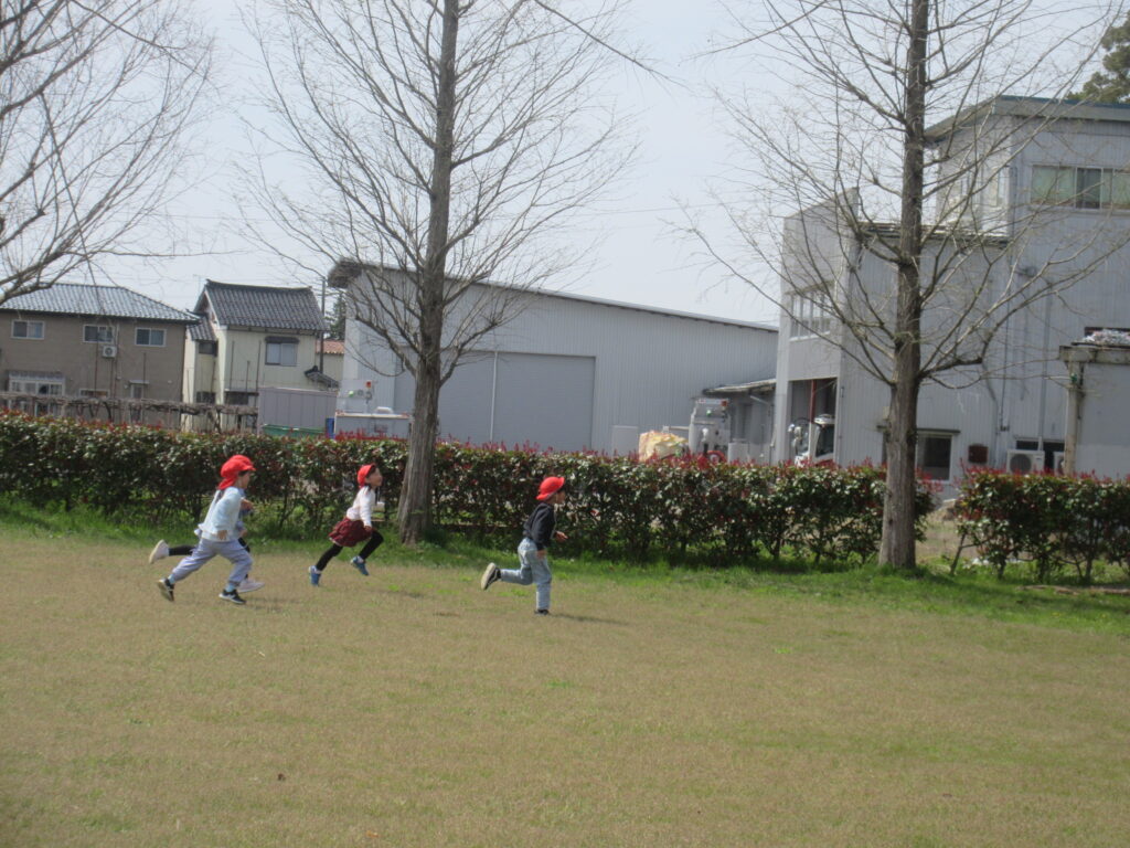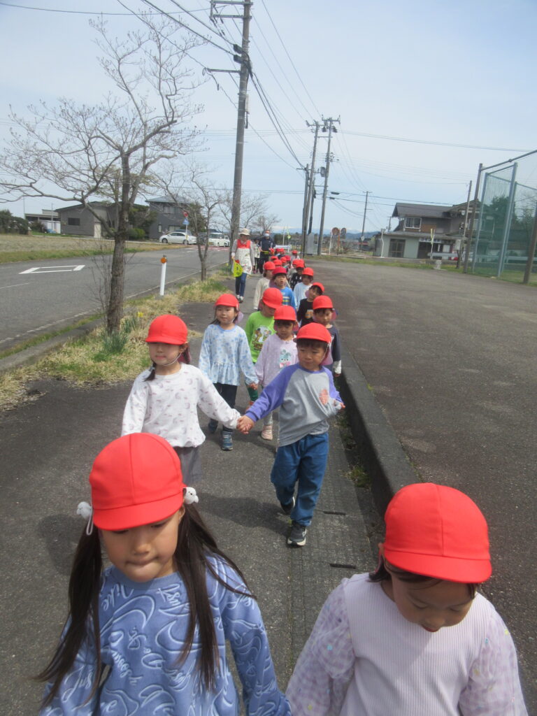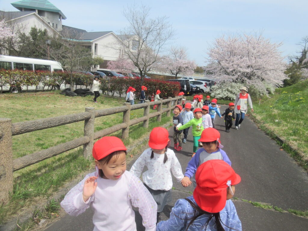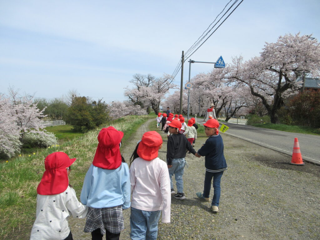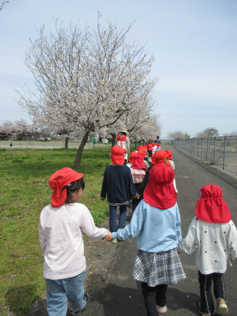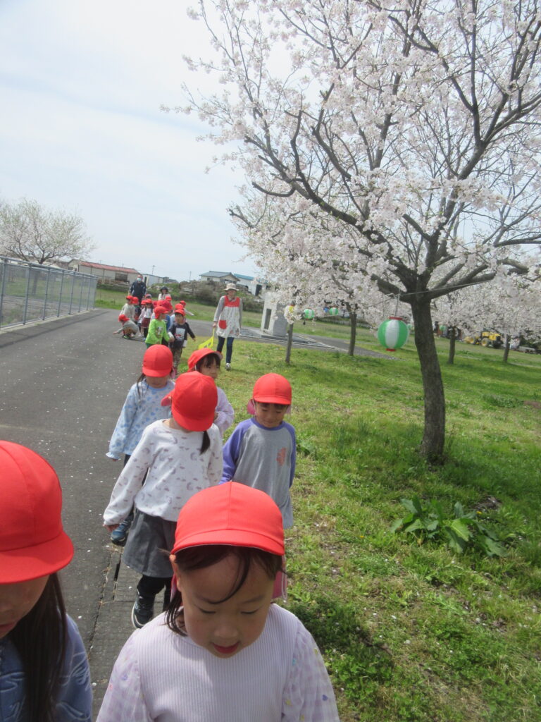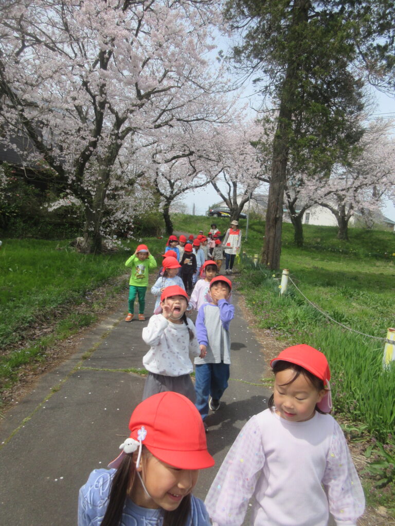 お花見をしながら小学校の周りをぐるっと散歩、たくさん歩いて疲れた帰りは給食が待ち遠しい様子でした。