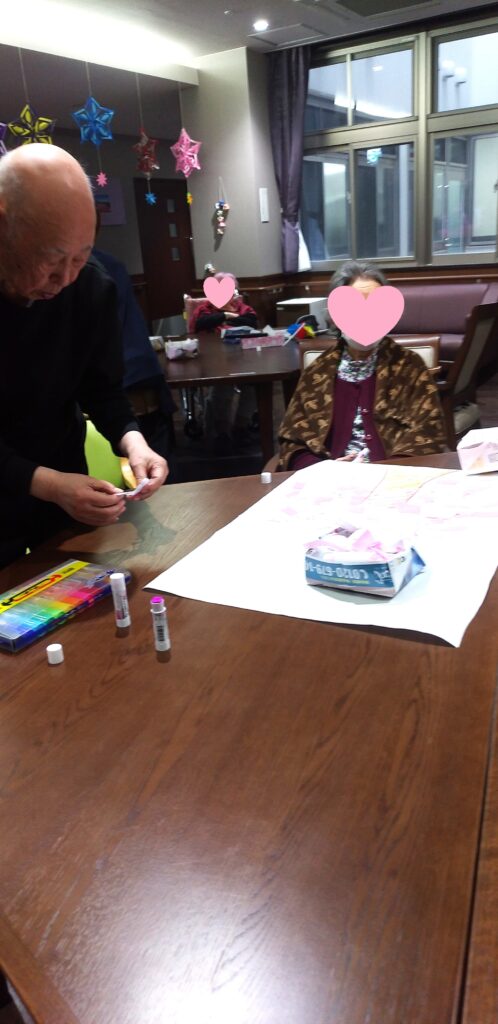 折り紙やお絵かきなど、子供の頃を思い出し、色紙を糊で貼る作業を楽しみながら行いました☺