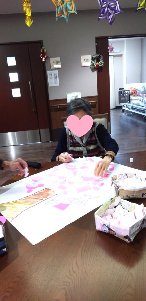 先日、ショートステイでは桜の木をちぎり絵で作りました!