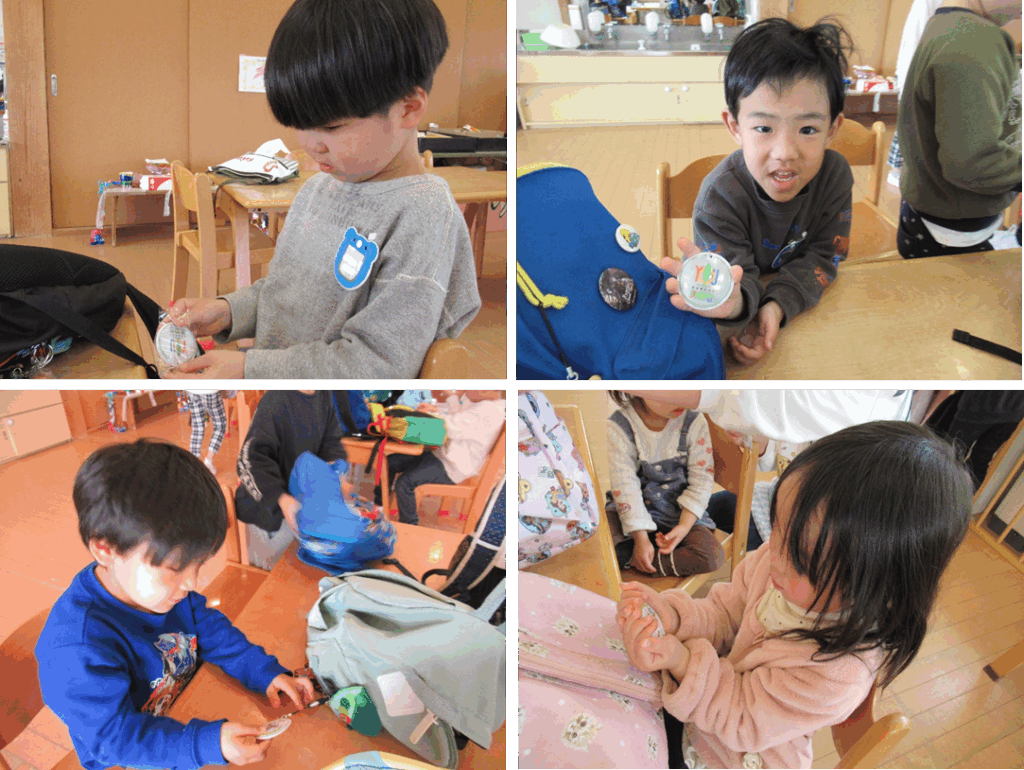 自分のリュックの目立つところに付け、大事そうに見つめる子どもたち。