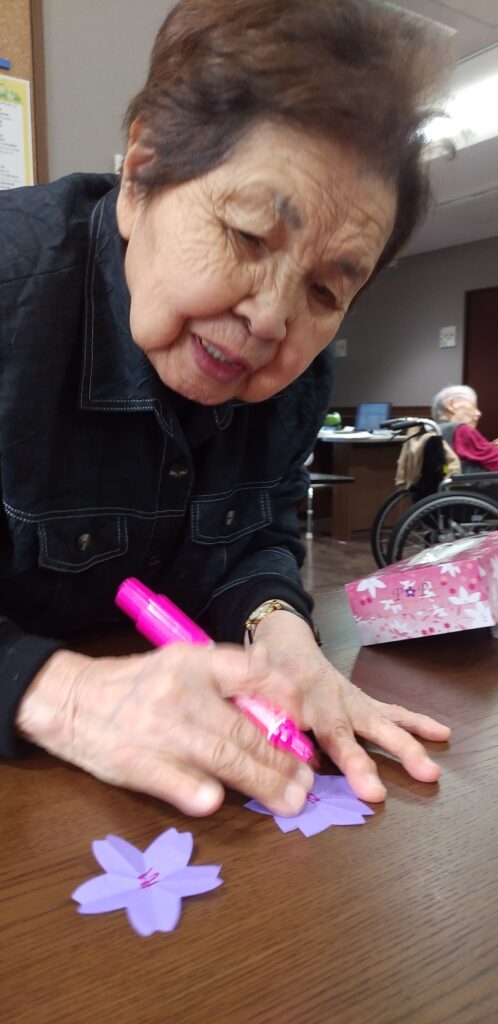また別の日には、お客様に折紙で桜の花飾り🌸を作っていただきました。