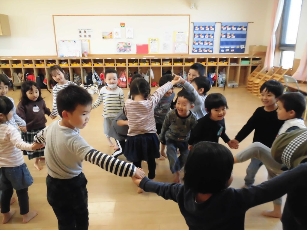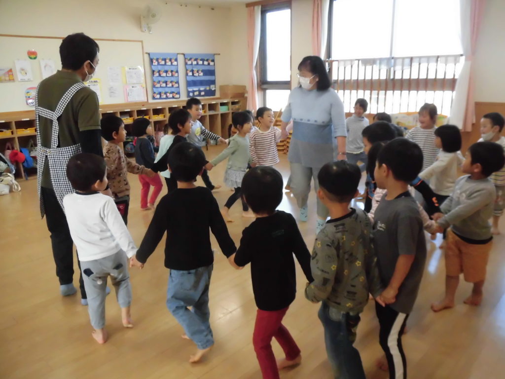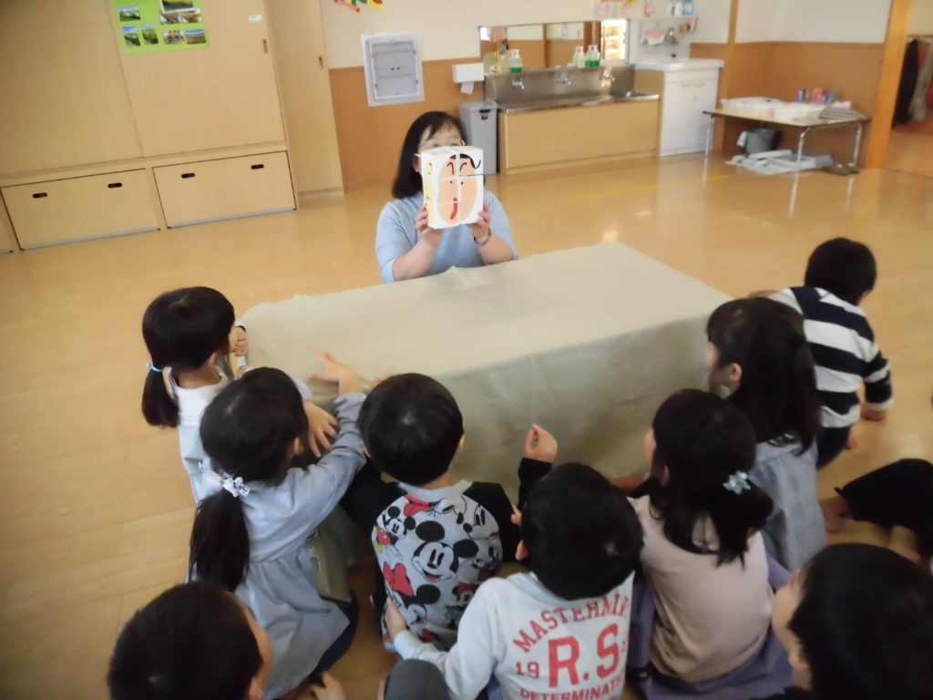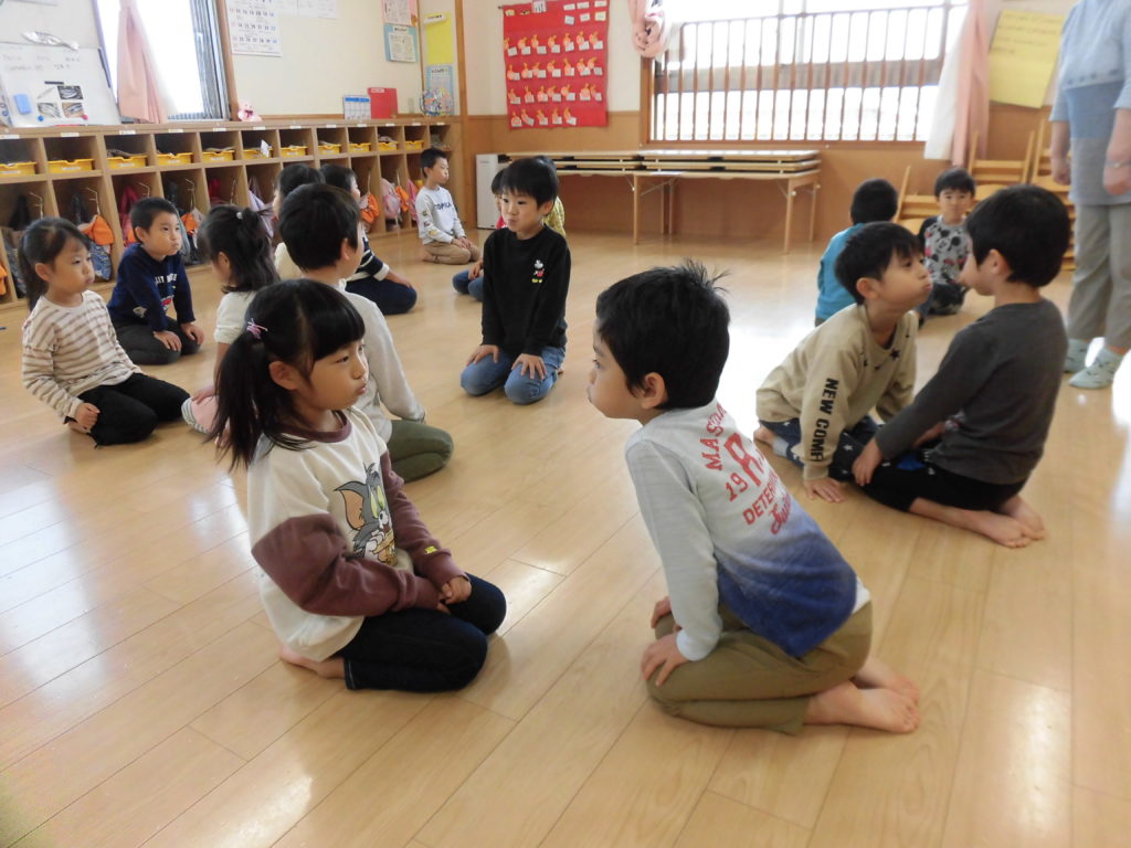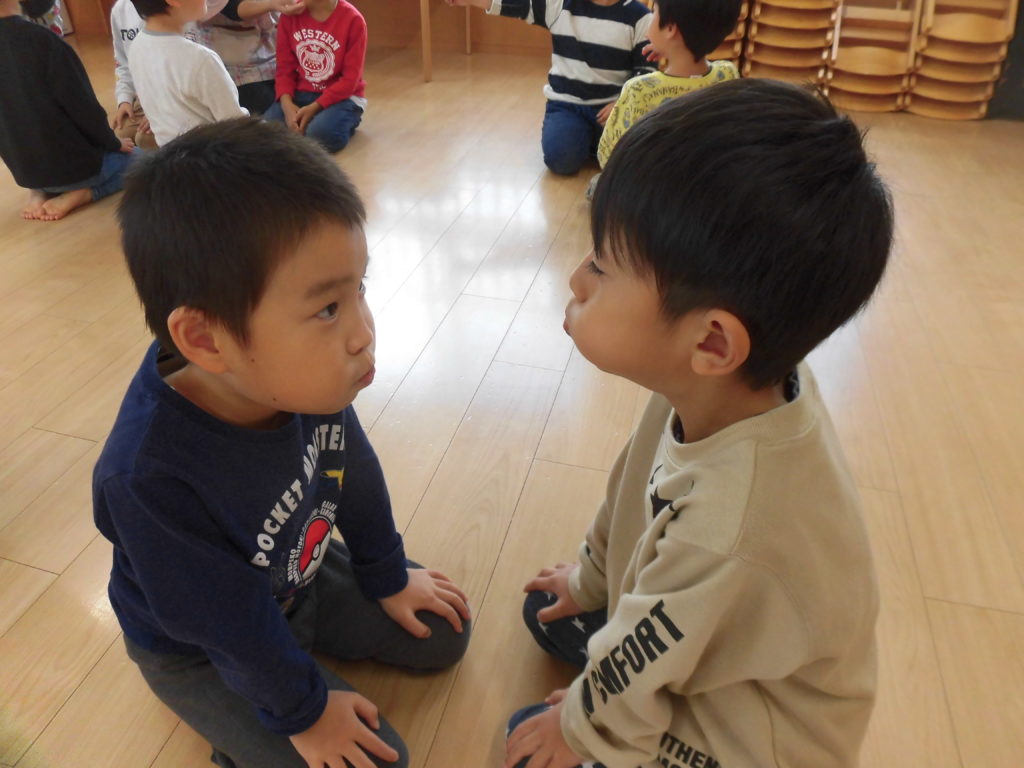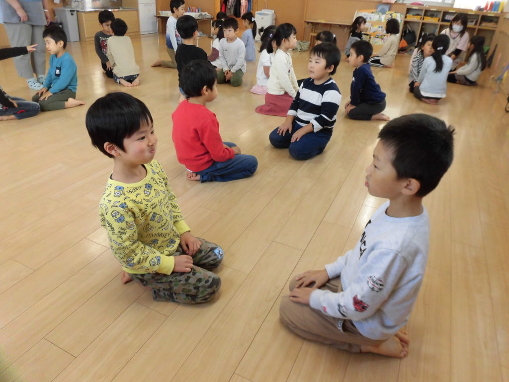 ニュース&トピックス コスモス将監保育園 【コスモス将監保育園】 掲載日2021.12.6 カテゴリー保育園 わらべ歌遊び 宮城わらべうたの会の講師の先生に来ていただき、わらべうたを楽しみました。子ども達の大好きなわらべ歌遊びは、どれも楽しいものばかりでした。😊 お友だちとにらめっこ。遊びを通してしっかり相手の目を見るという事が出来るようになるそうです。また、大きなお手玉を上手に頭に乗せたり、クラスみんなで手を繋いで、離さないで歩くことも楽しみました。わらべ歌には様々な意味が込められていて、とても大切な伝承遊びなんだなと思いました。 最後に先生から楽しいお話。子ども達が大好きなお話の一つです。