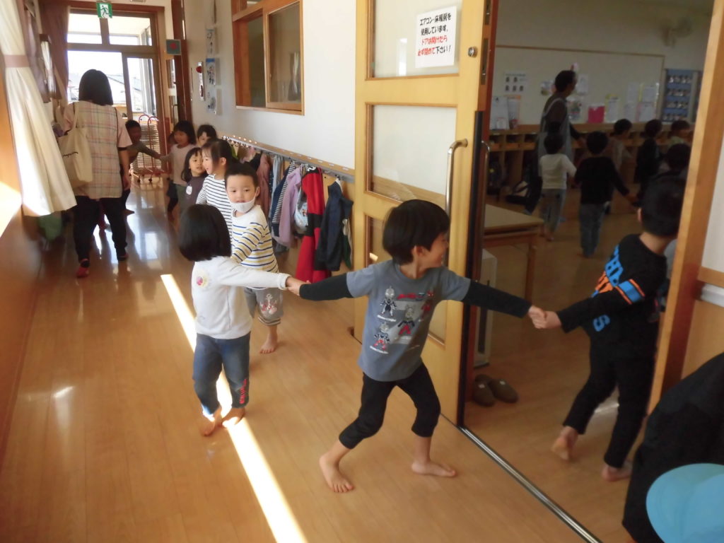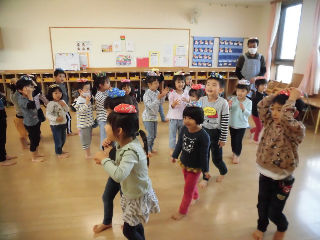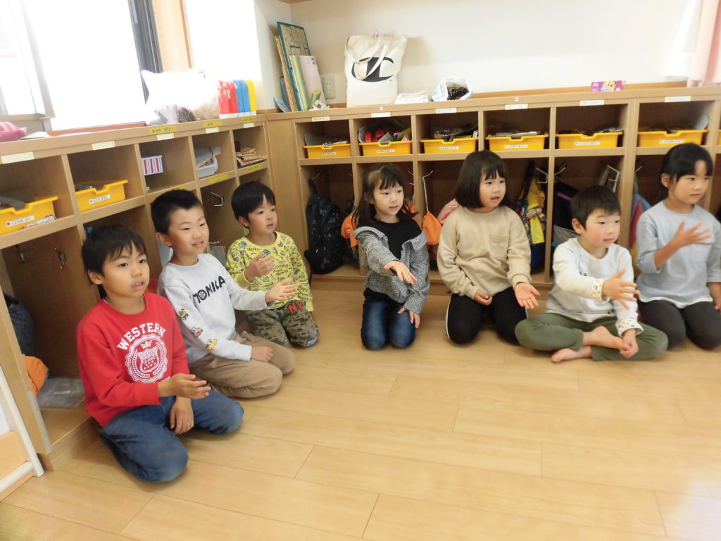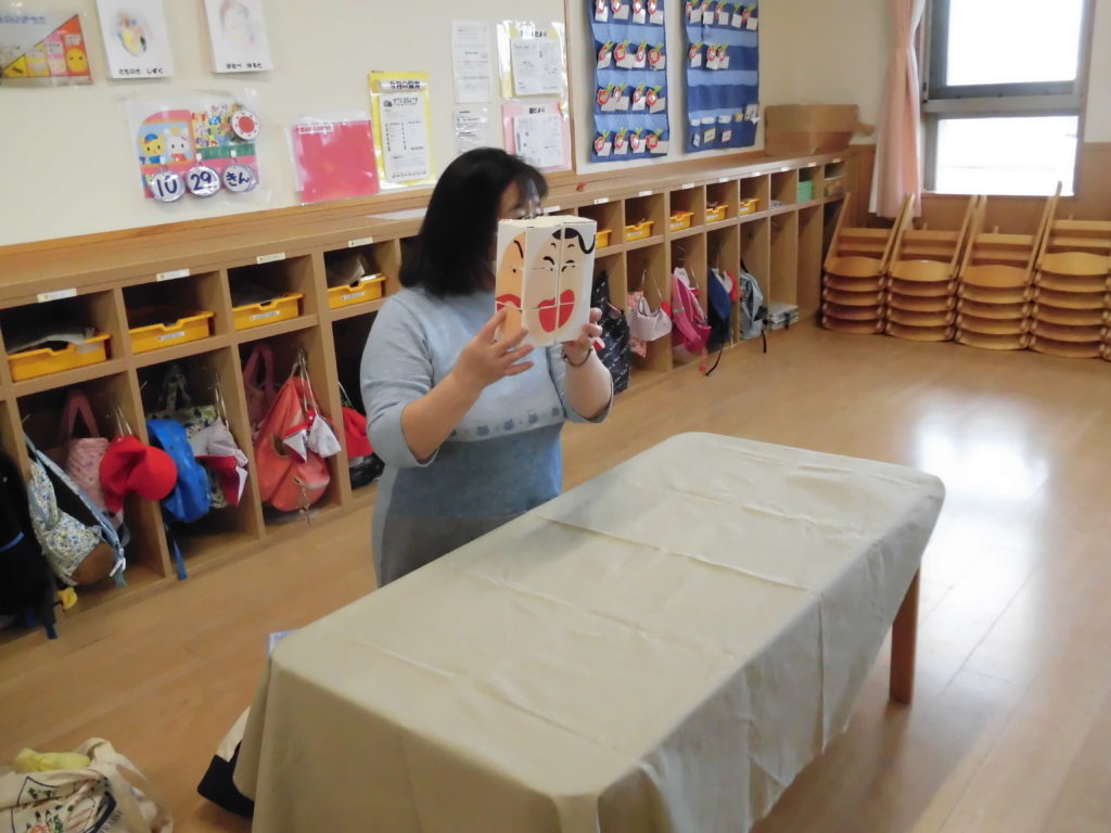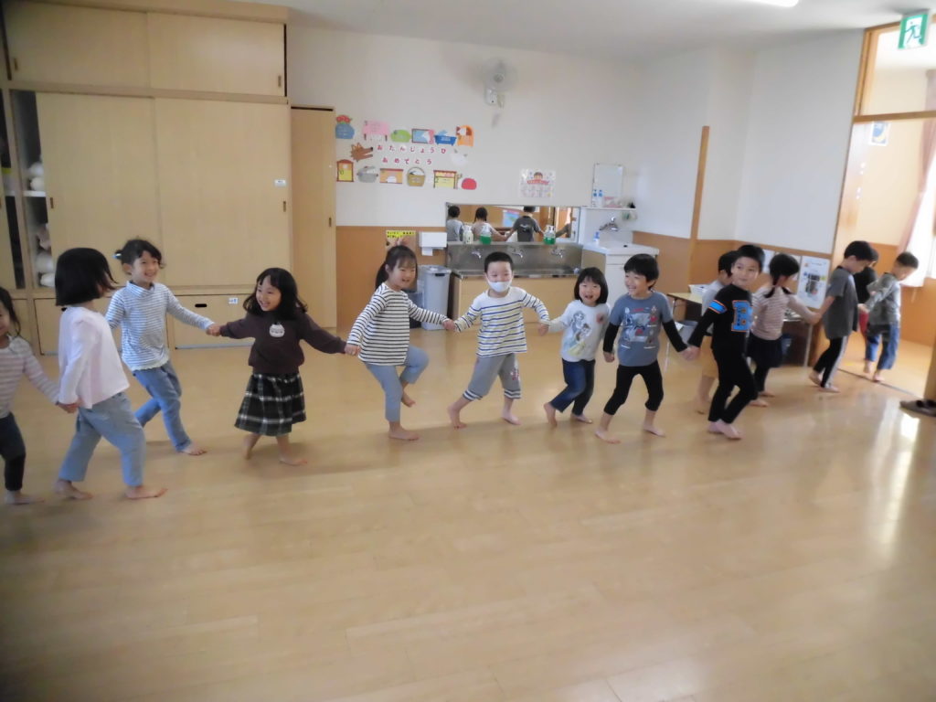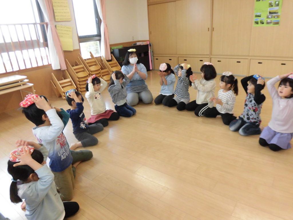 ニュース&トピックス コスモス将監保育園 【コスモス将監保育園】 掲載日2021.12.6 カテゴリー保育園 わらべ歌遊び 宮城わらべうたの会の講師の先生に来ていただき、わらべうたを楽しみました。子ども達の大好きなわらべ歌遊びは、どれも楽しいものばかりでした。😊 お友だちとにらめっこ。遊びを通してしっかり相手の目を見るという事が出来るようになるそうです。また、大きなお手玉を上手に頭に乗せたり、クラスみんなで手を繋いで、離さないで歩くことも楽しみました。わらべ歌には様々な意味が込められていて、とても大切な伝承遊びなんだなと思いました。 最後に先生から楽しいお話。子ども達が大好きなお話の一つです。