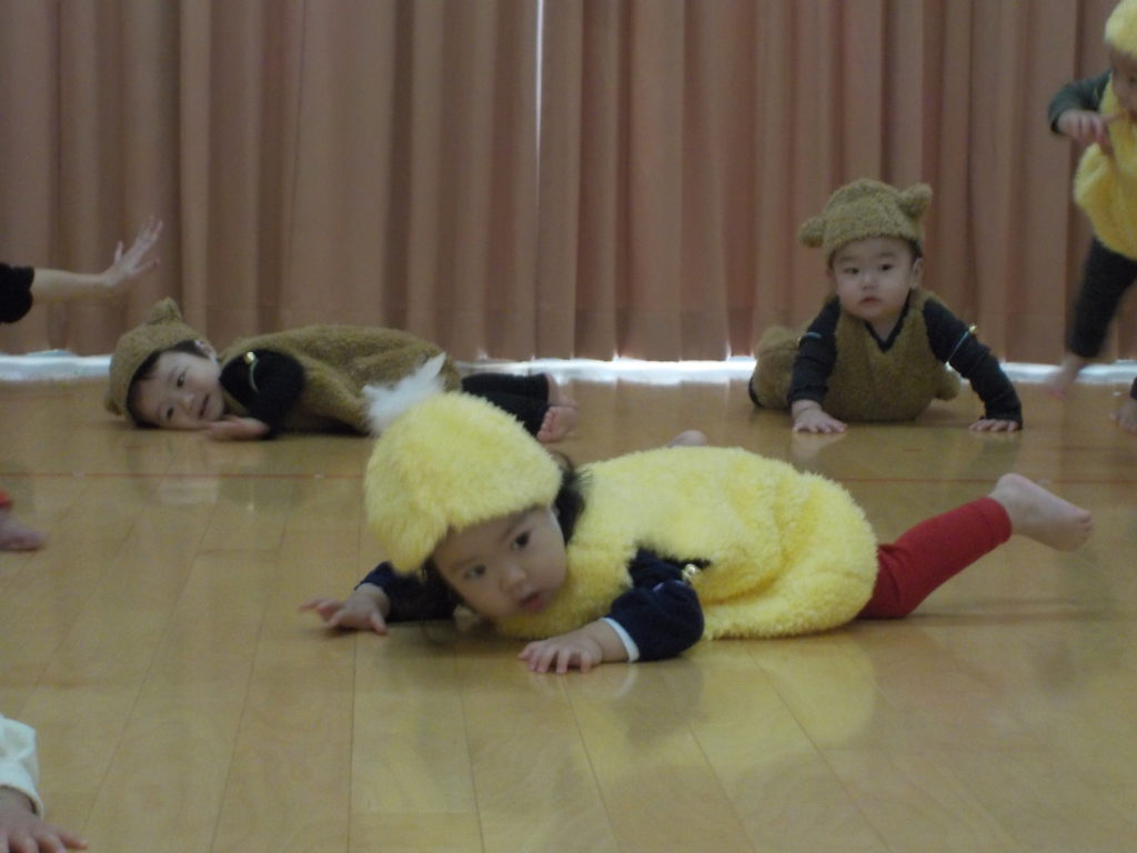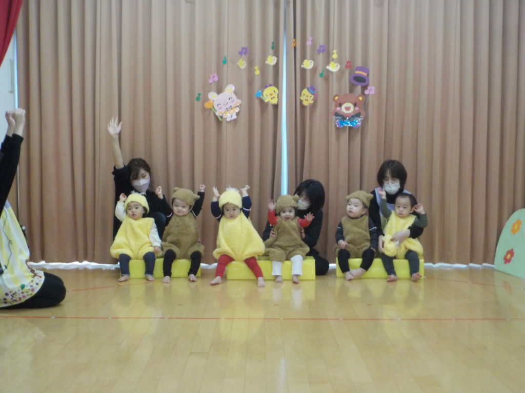 ひかり組さんは、ひよことくまさんのモコモコ衣装に身を包み、大好きないないいないばぁ遊びや、ピカピカブーのダンスを披露してくれました!