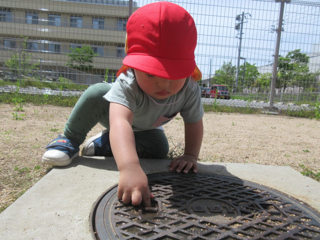 マンホールの小さな穴に水たまりを発見👆 触って楽しんでいました😊