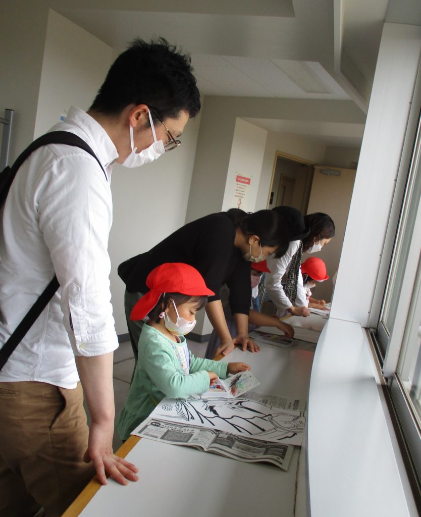 クレヨンを使って親子でイラストを塗りました♪中には、オリジナルのイラストを描いているご家庭も✨
