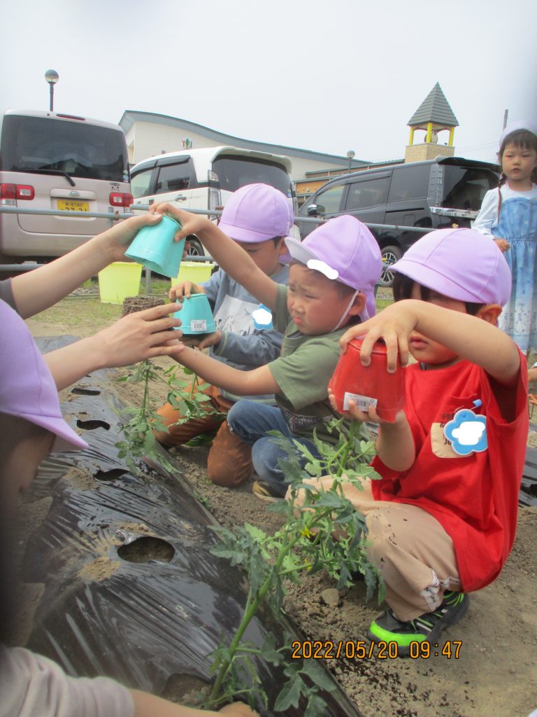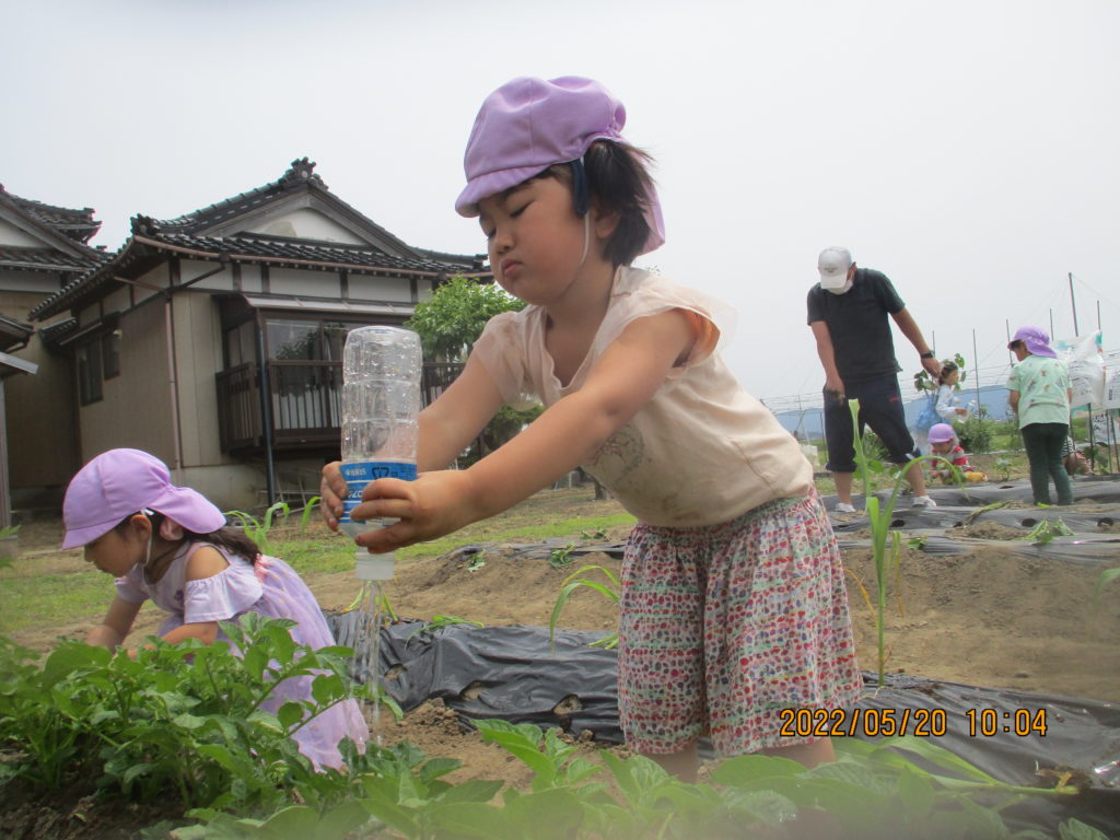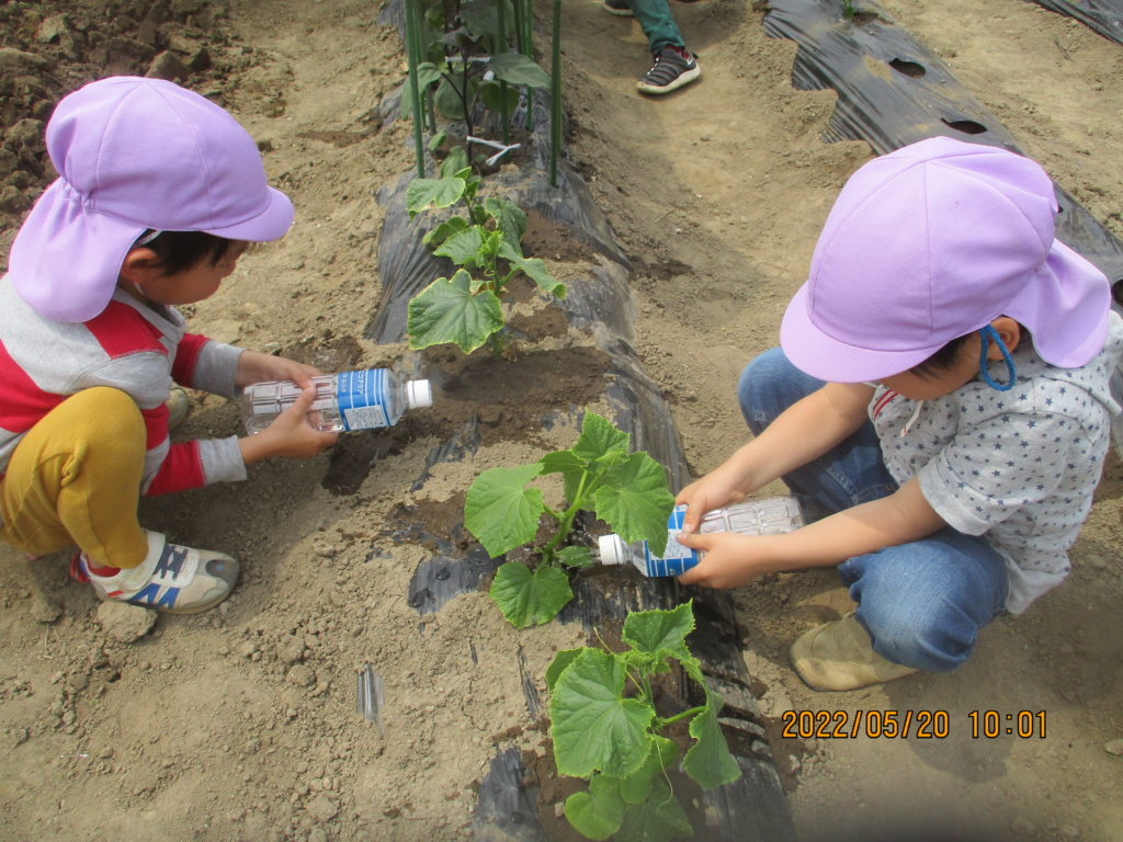 「野菜を植え終わったら、最後は何をするの?」と子どもたちに聞くと「水やり~~」と大きな声で答えて、何回も何回も水やりをして「大きくなってね」と願いを込めていました💞