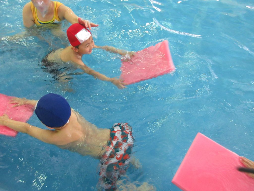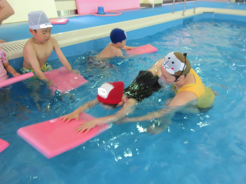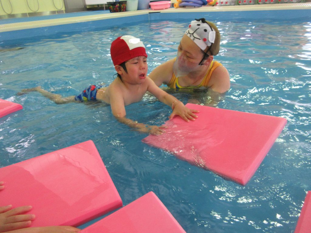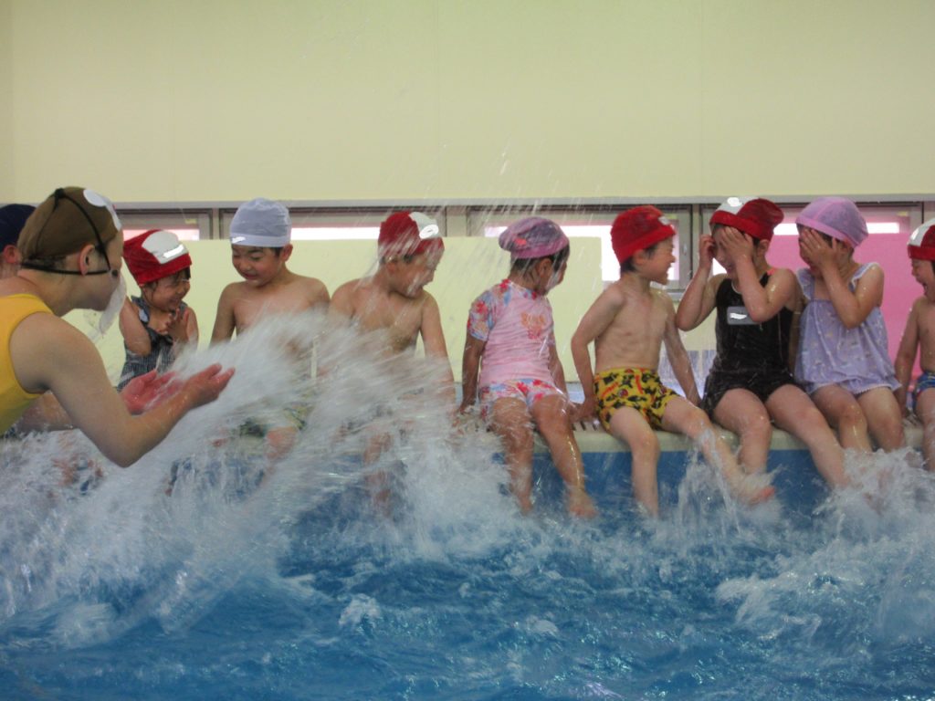 元気に挨拶をして、プールサイドに座り大きな水しぶきができるほどバタ足をしていました。