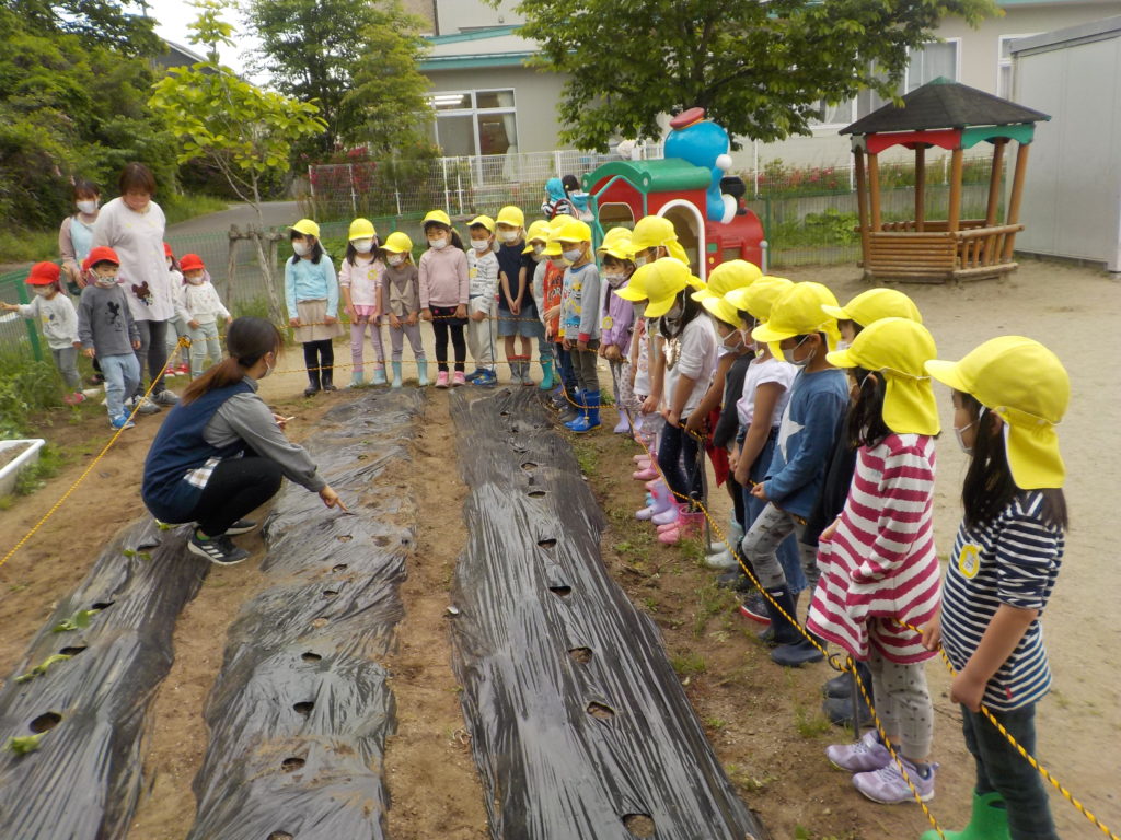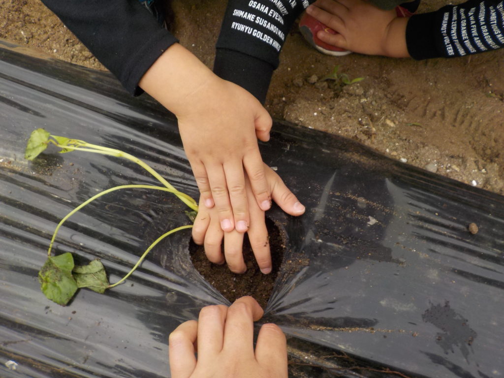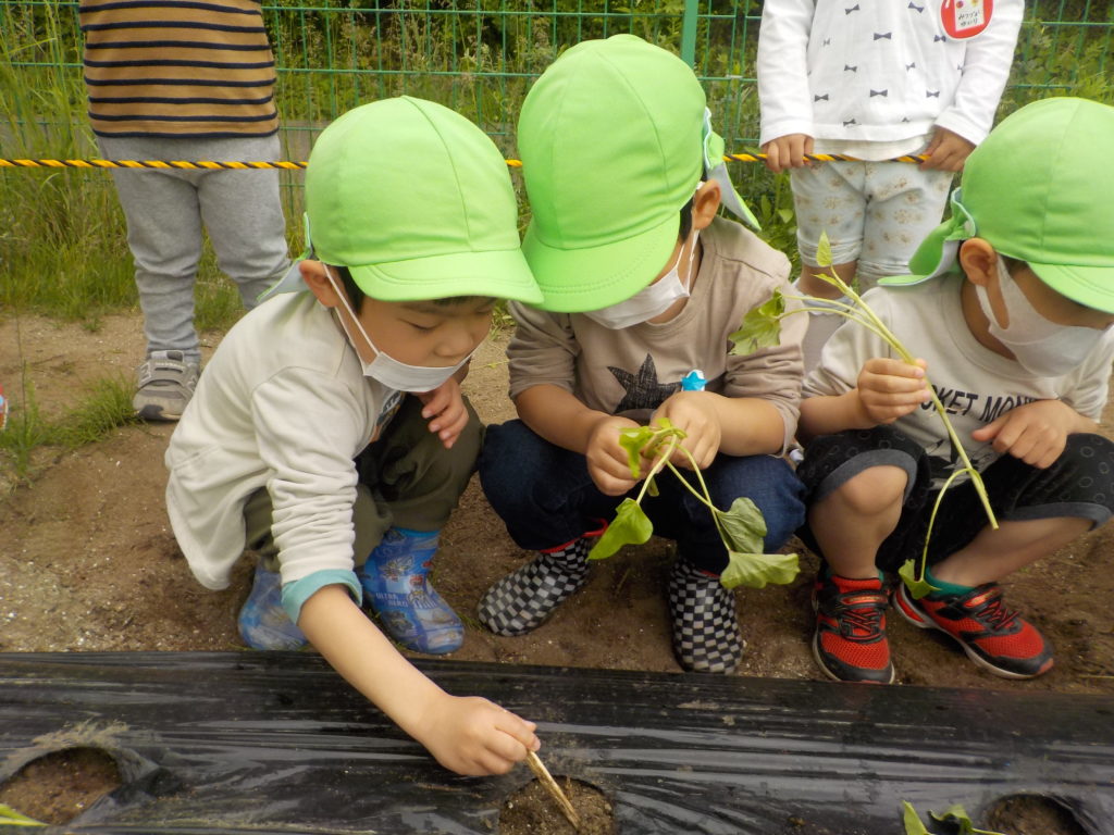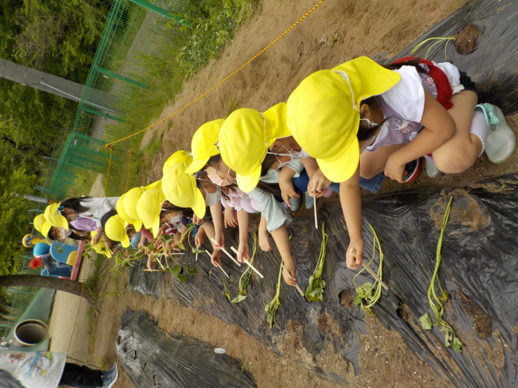 今年も保育所の園庭にある畑に、つき組(4歳児)・たいよう組(5歳児)がさつまいもの苗を植えました。品種は紅あずまというホクホク系のあま~いお芋です🍠