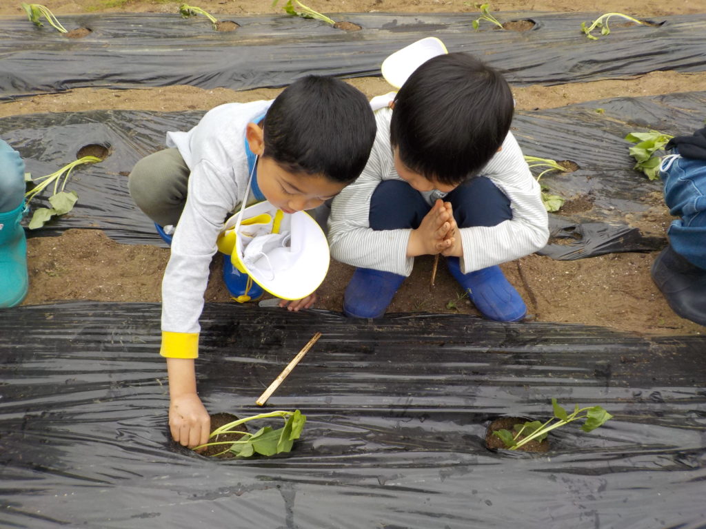 「僕が先に穴を開けるね!」2人で協力して苗を植える姿に成長を感じます✨