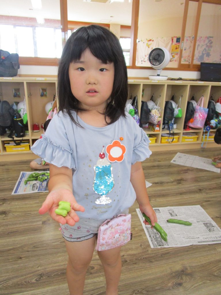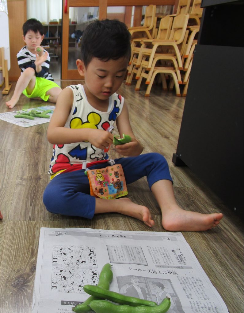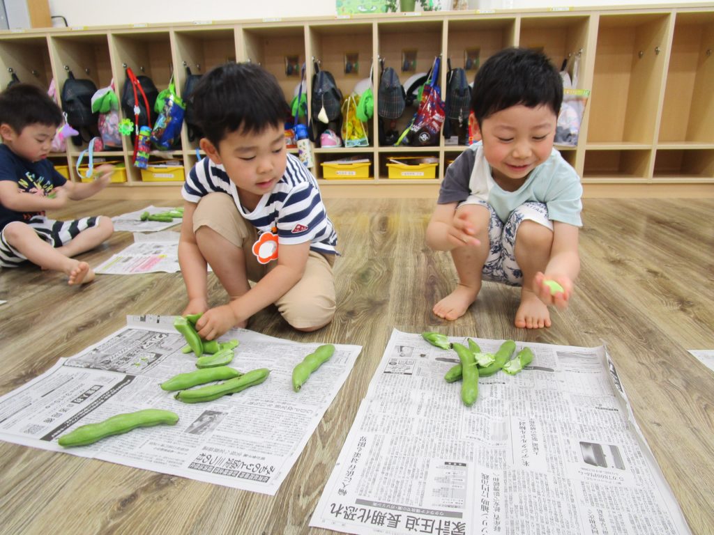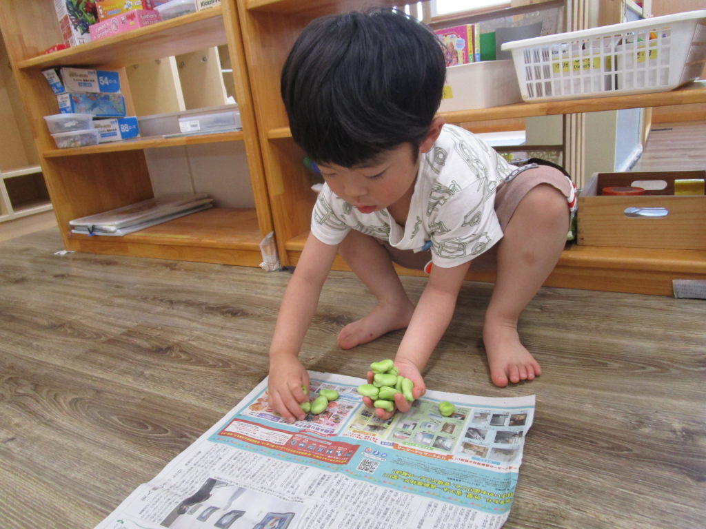 今日のおやつの『そらまめ』。皮むきにチャレンジしました!絵本『そらまめくんとめだかのこ』を読み、「本当にそら豆のベッドはフワフワなのかな~」と疑問の声。実際に見てみよう!