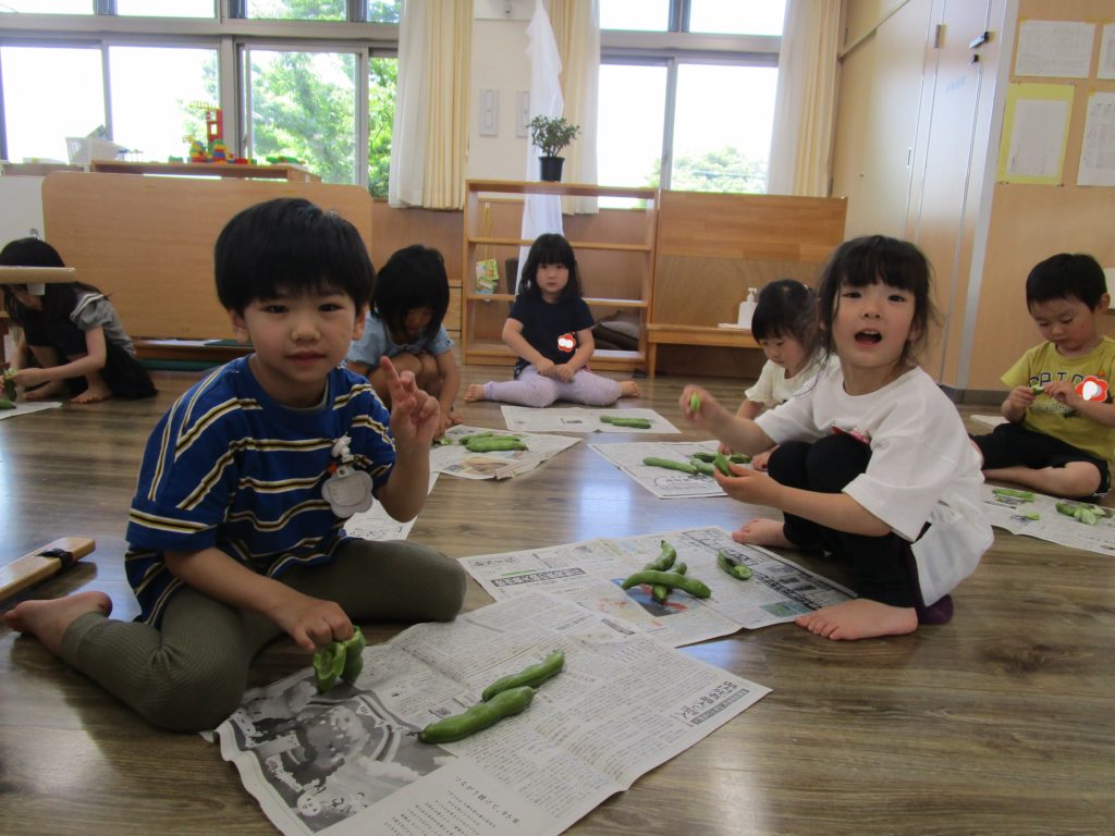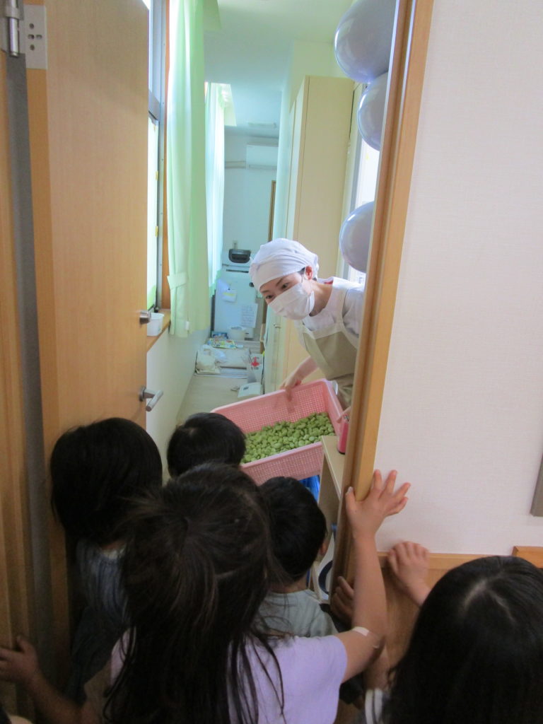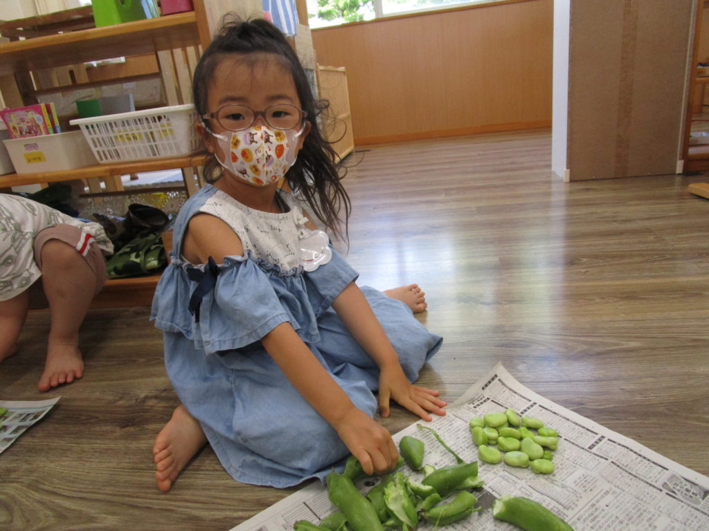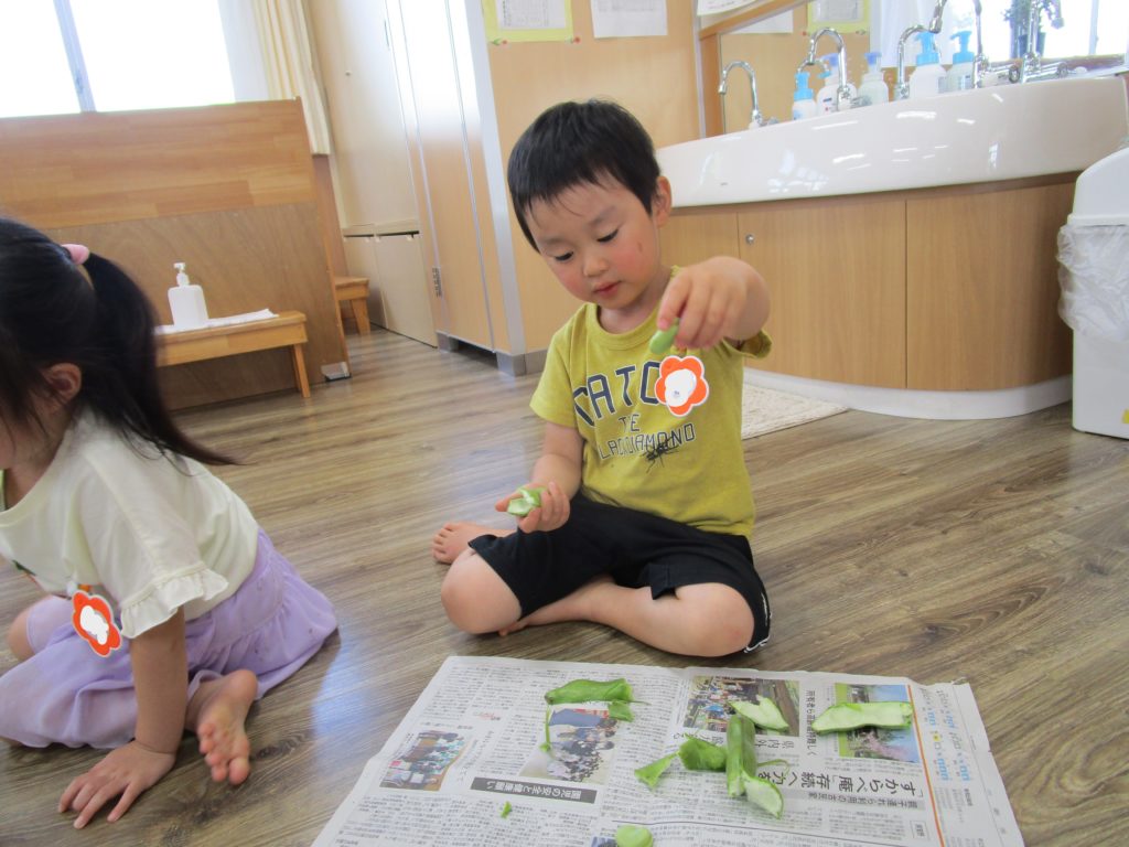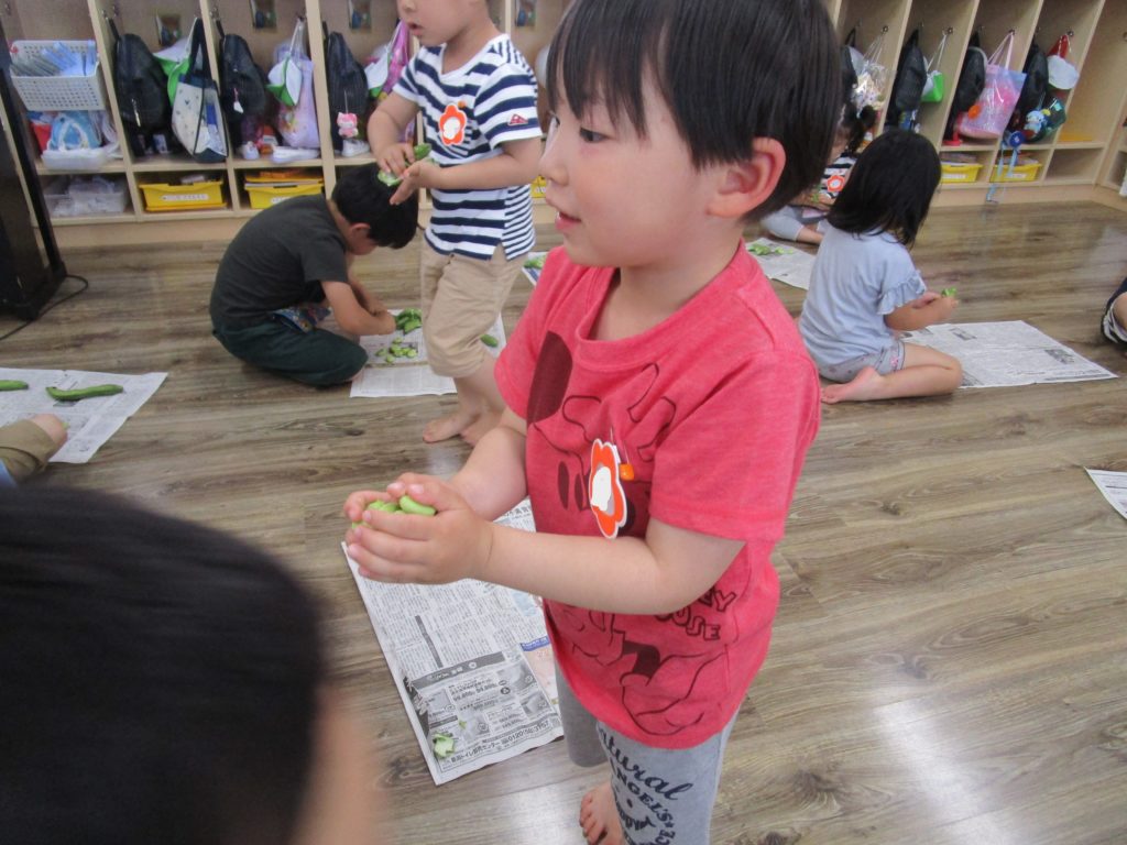 そらまめくんのベッドは本当にフワフワな事、並んで入っている事など実際に皮むきをする中で発見していました。自分たちが手伝った食材がメニューになったり、他の年齢のお友達が食べてくれたりする事も喜びの一つですね。苦手な食材もこんな取り組みの中で「食べてみようかな」と思えるきっかけになれば良いですね。