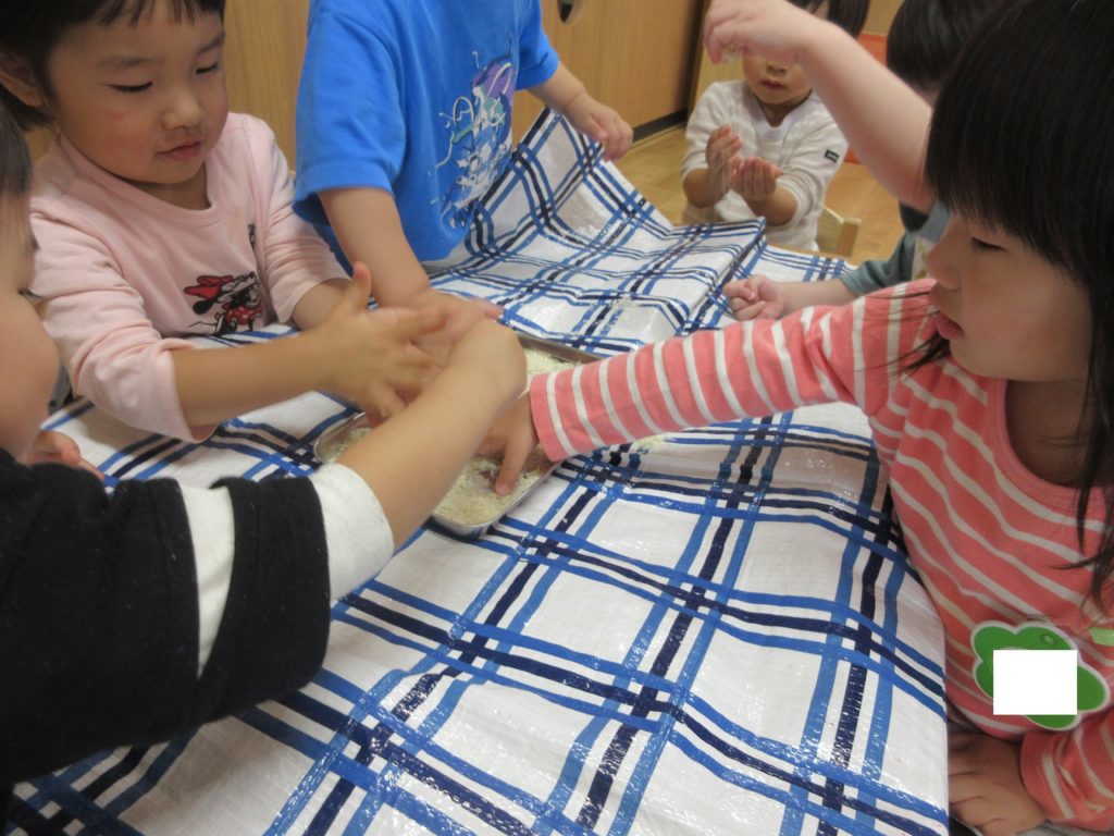 「ちょっとちくちくするね~!」と言って、みんなパン粉に興味津々です。