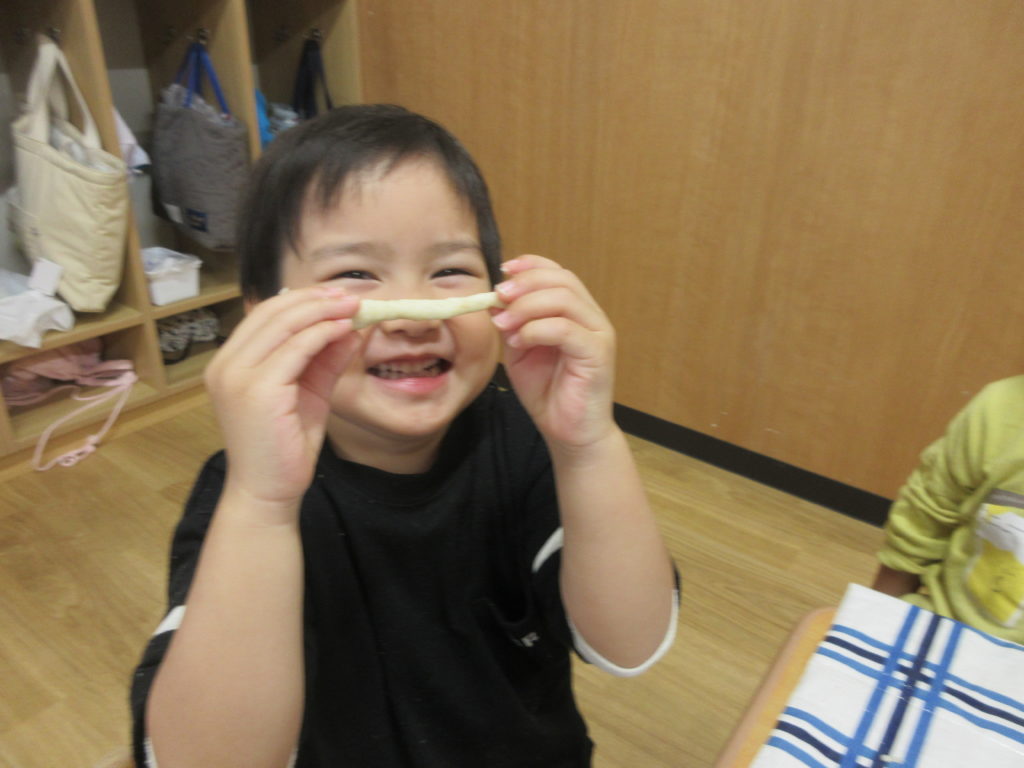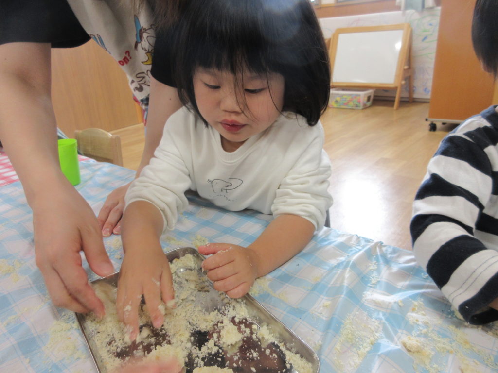 パン粉のざらざらとした感触と粘土のもちもちとした感触、それぞれを存分に楽しんでいました。またやろうね😊