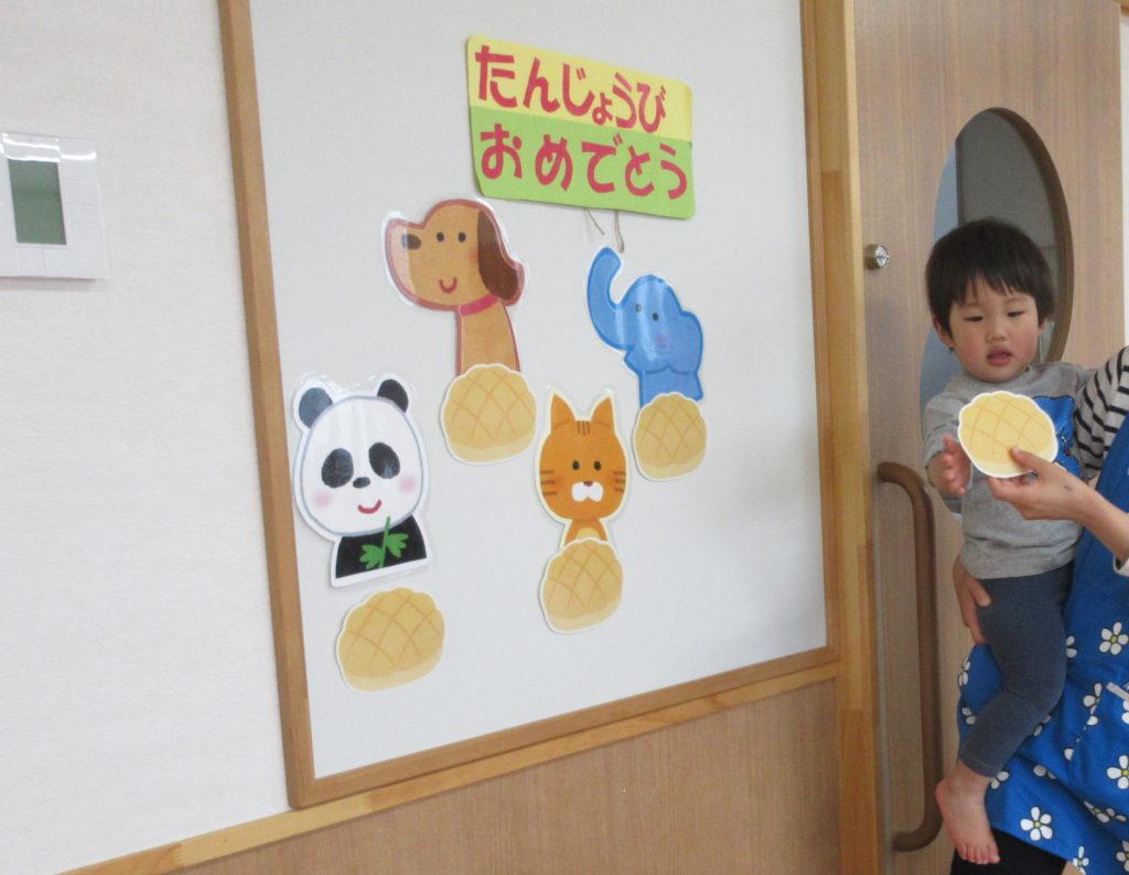 今月のお誕生会の出し物は、つぼみぐみ&めばえぐみのお友だちが好きな歌のひとつ、「♪いつつのメロンパン」!🍞 色々な動物がパン屋さんにお買い物に来ると、大喜びで指をさしたり、お口をもぐもぐしたりしていました🐰