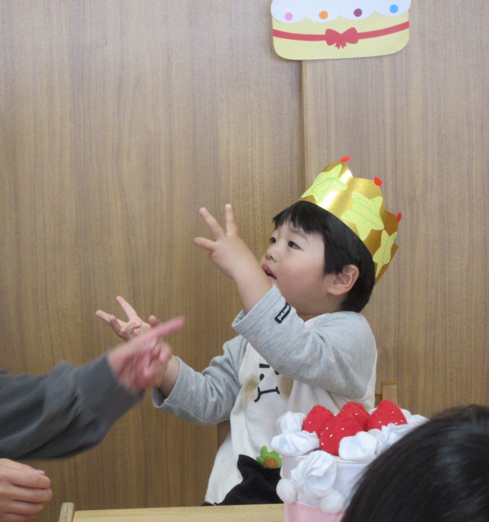 お友だちからのハッピーバースデーの歌とケーキ、誕生日カードのプレゼントに嬉しくてにっこり笑顔です😊