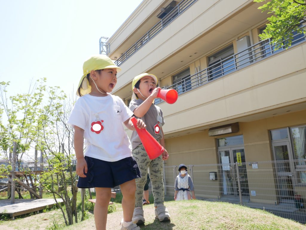 砂場のおもちゃをメガホンに見立てて応援します!