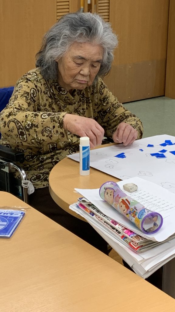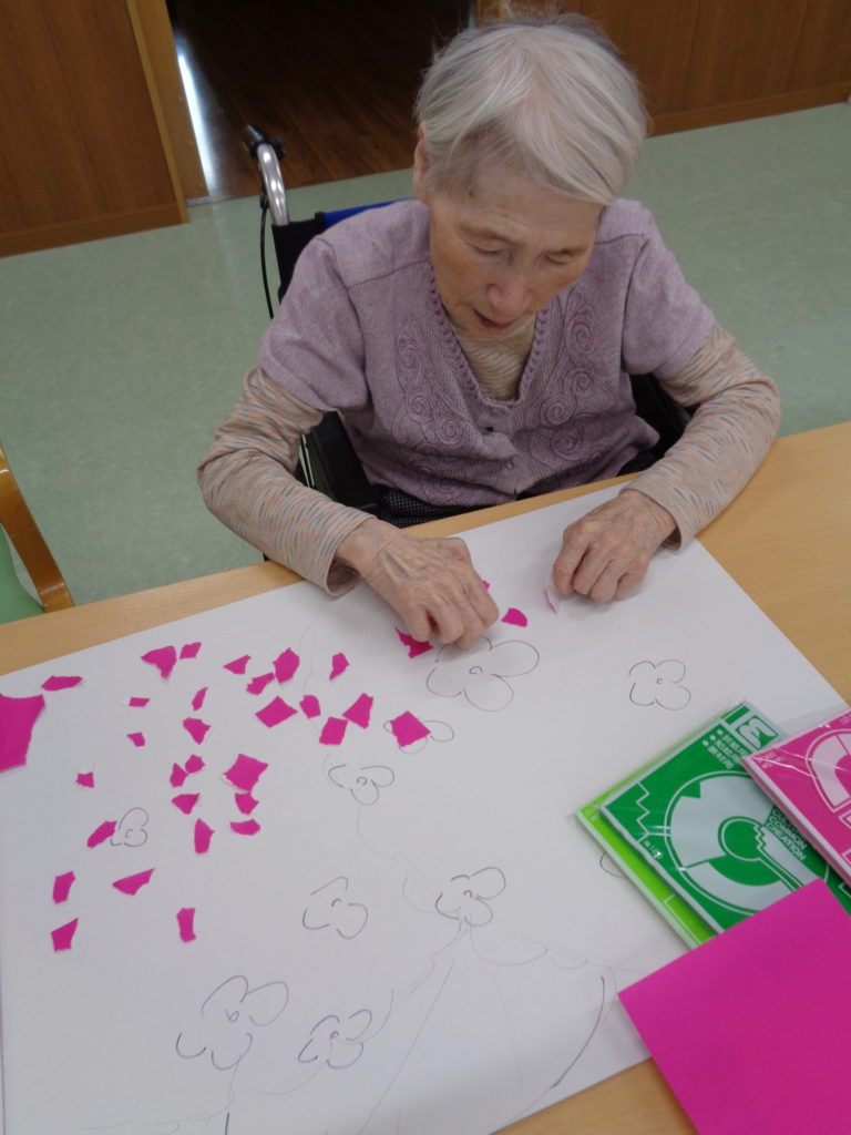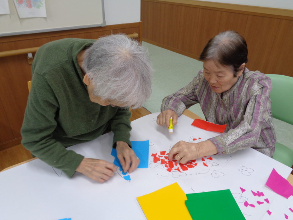 お好きな色の折り紙を小さくちぎって貼っていきます・・・