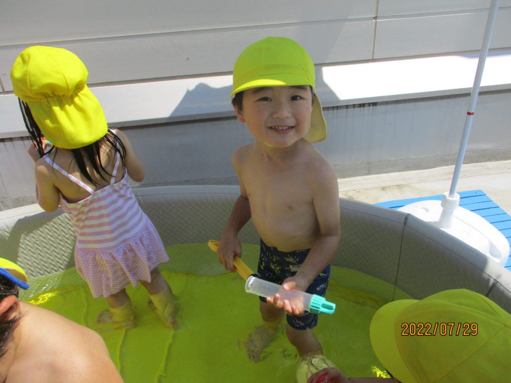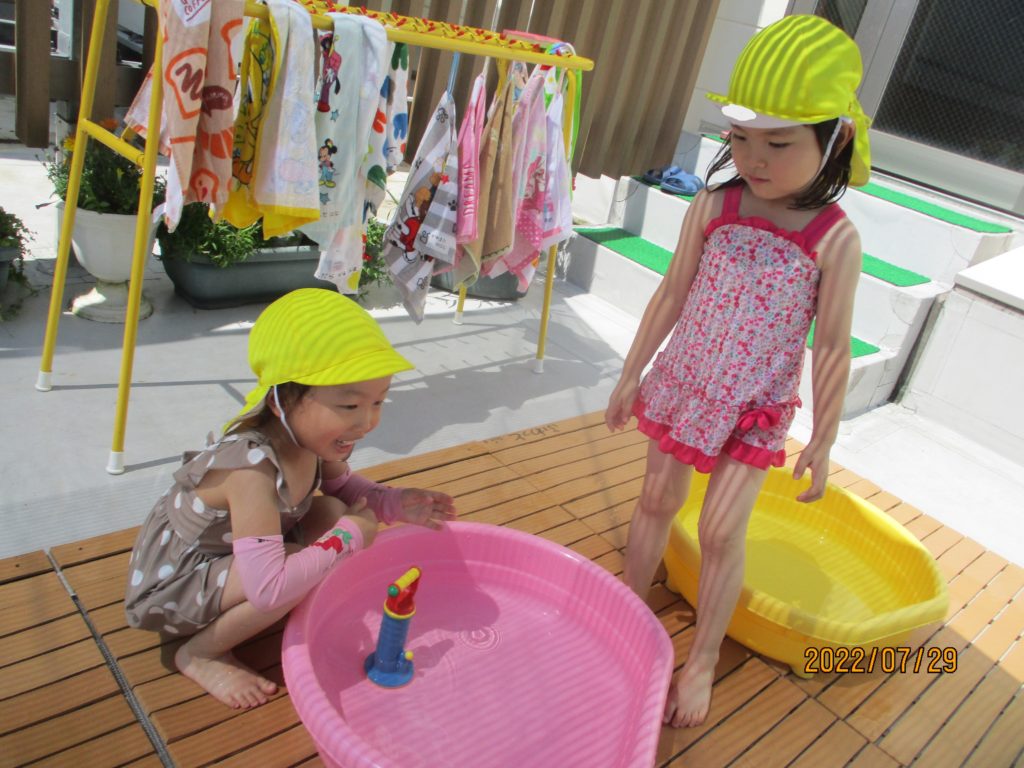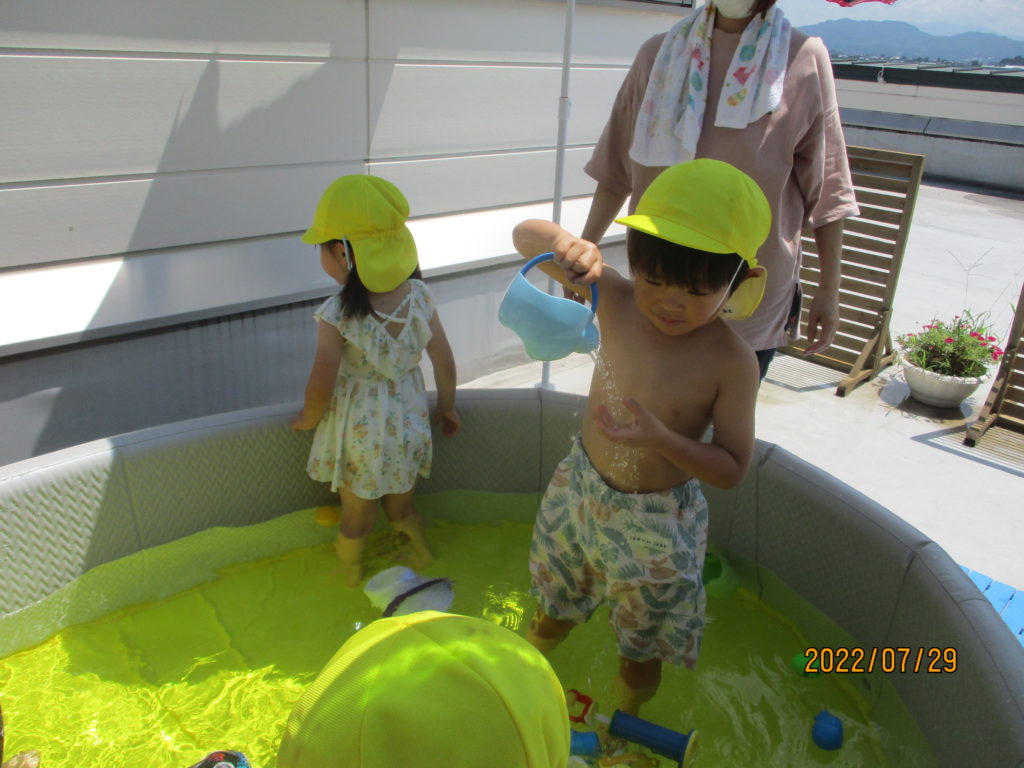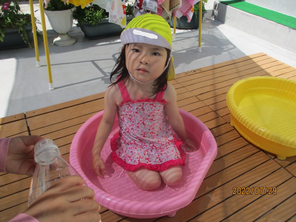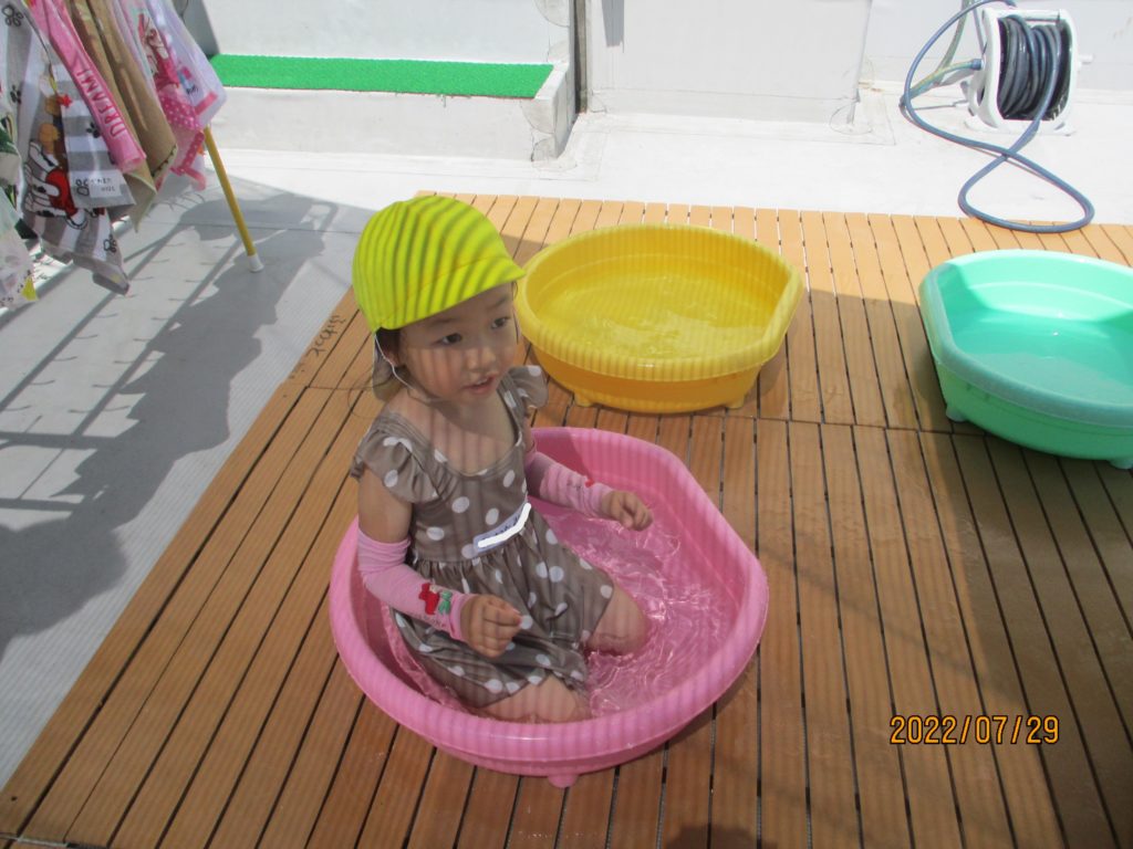タライの中にぽちゃりと入って遊んでいるお友だちもいました。気持ちよさそうですね😊