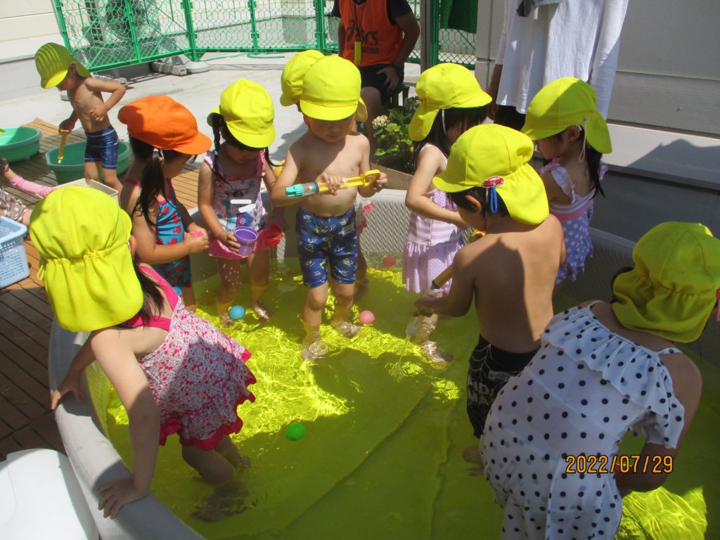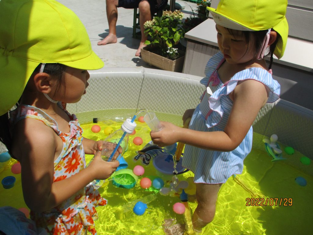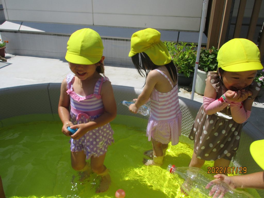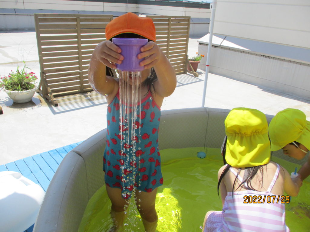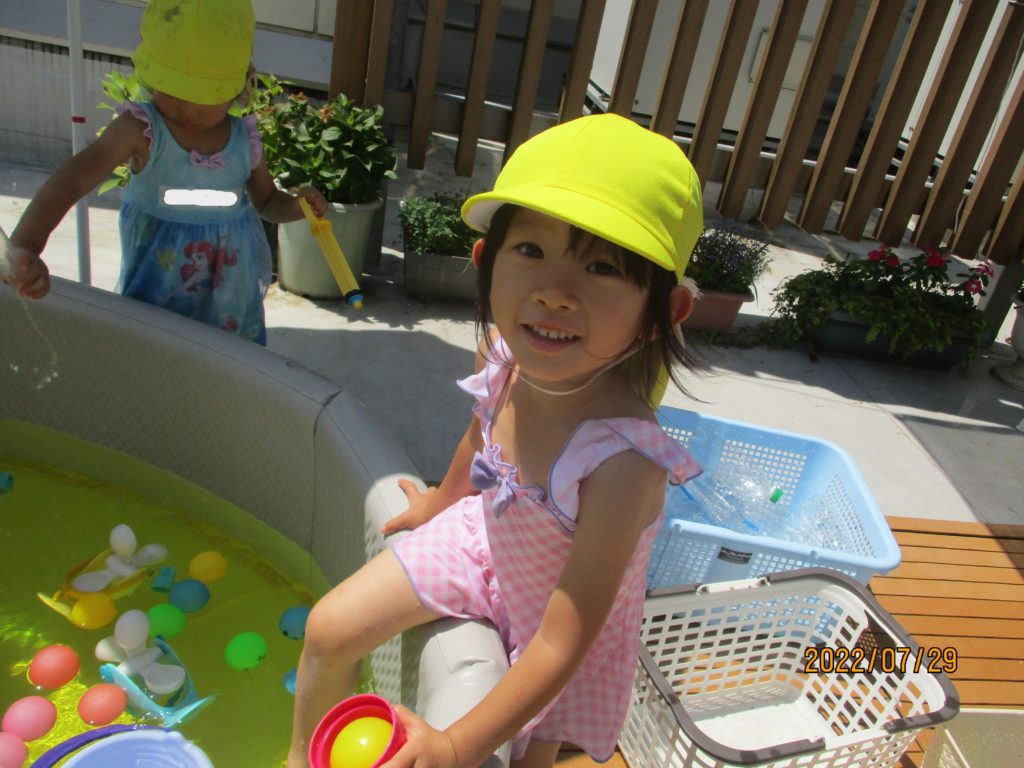 タライの中にぽちゃりと入って遊んでいるお友だちもいました。気持ちよさそうですね😊