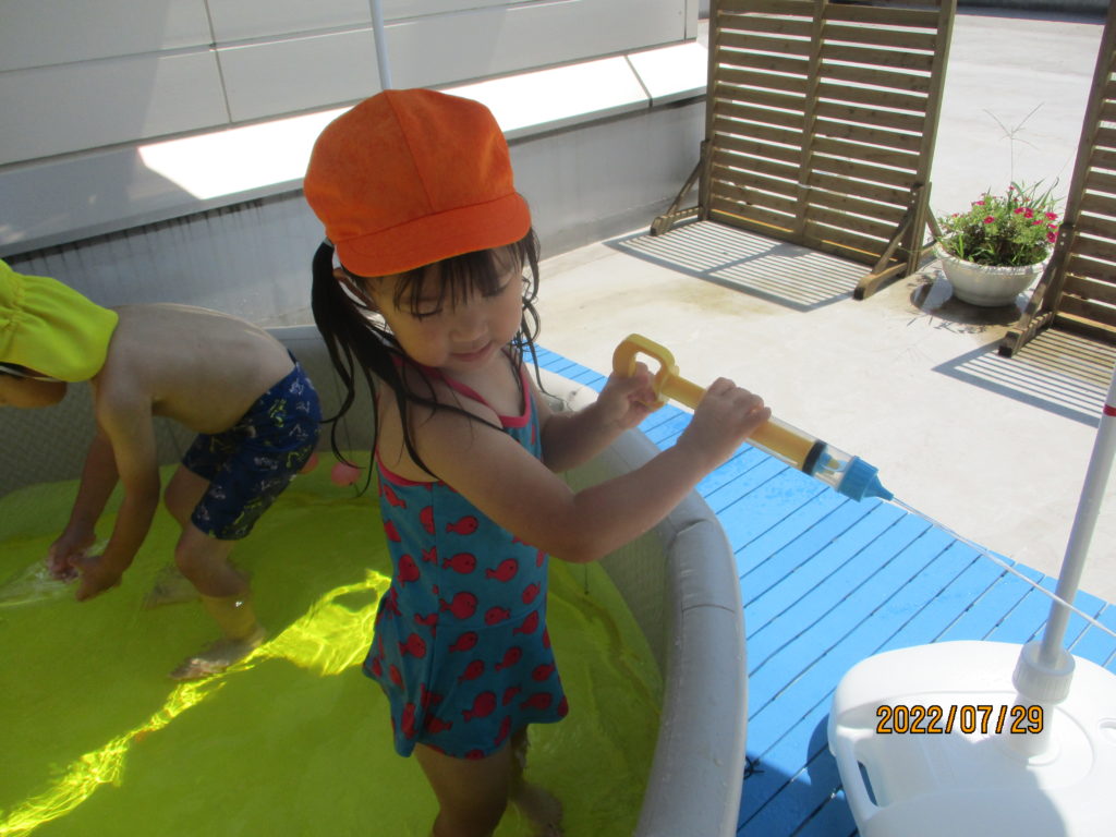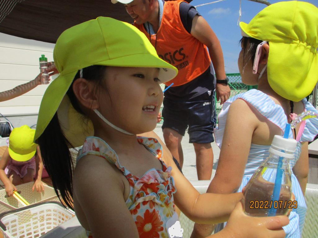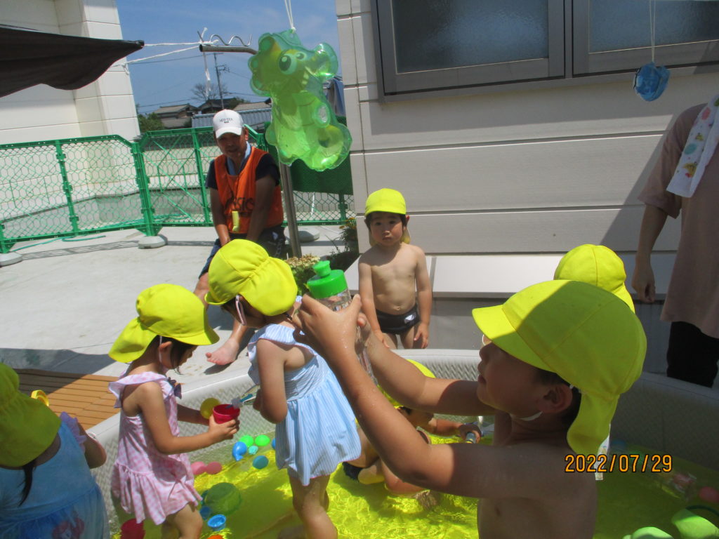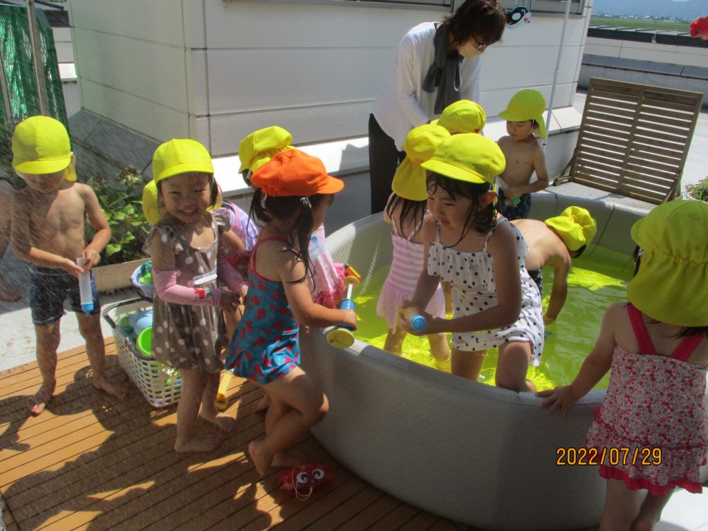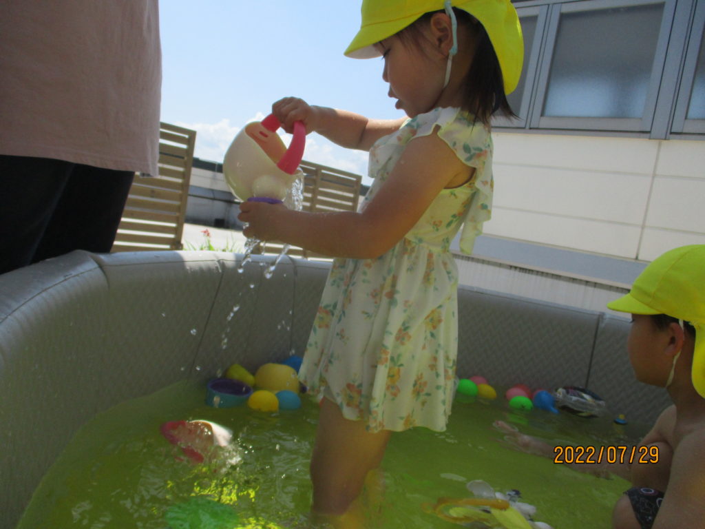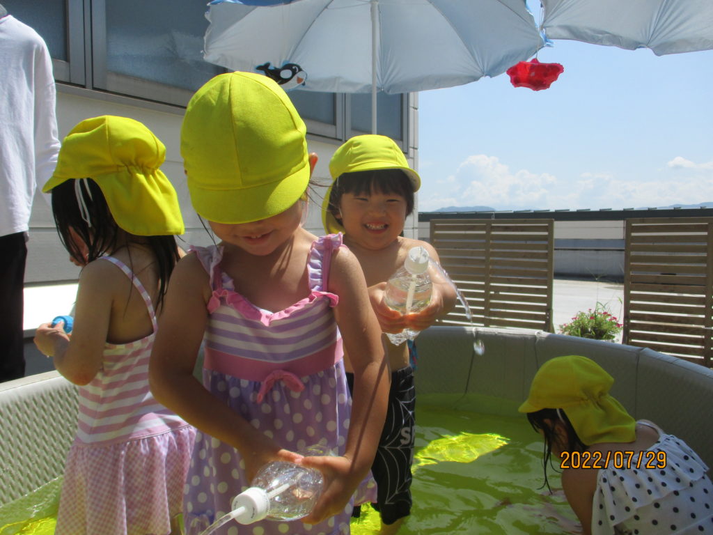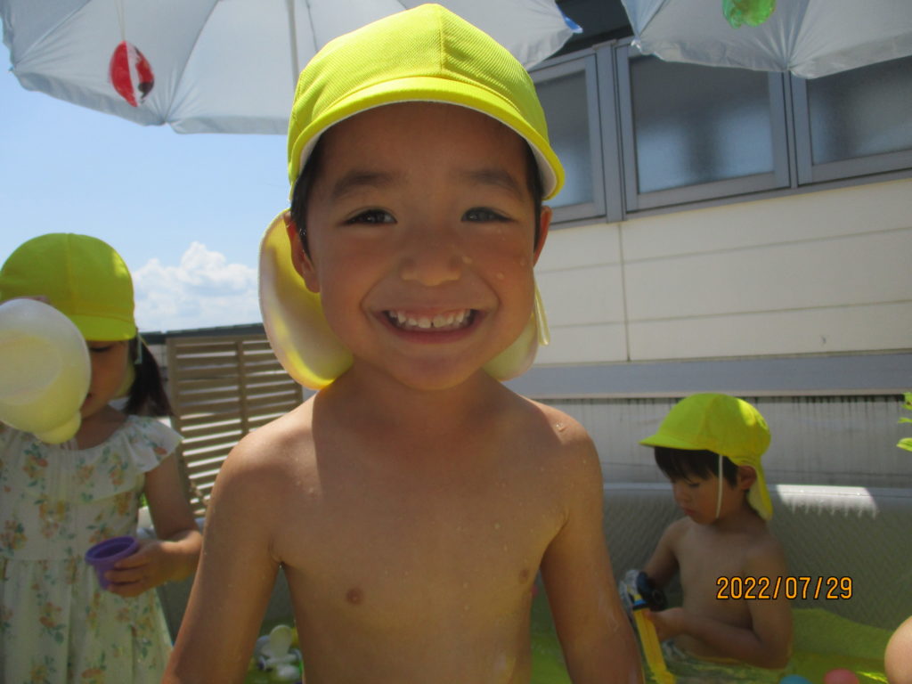 今年度初めての水遊びをしました!!今年度はふわっとさんのガーデン(屋上)にプールを出してのびのびと水遊びを楽しみます。水着を着るのも楽しみで、お友だちと見せ合いっこをしながら楽しんでお着替えもしていましたよ♪